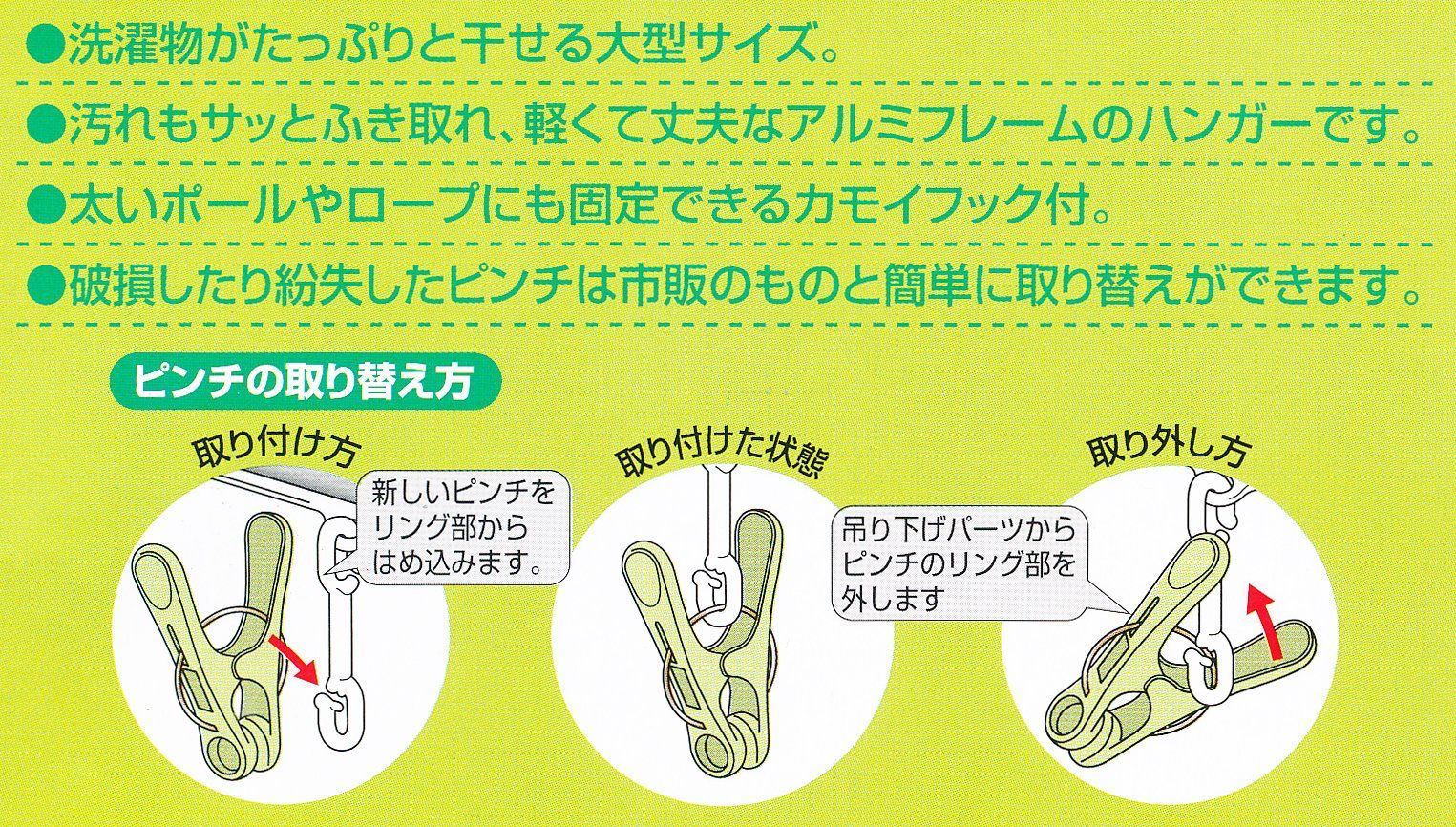 ●破損したり紛失したりしたピンチは市販のものと簡単に取り替えができる 製品サイズ:約70×35cm 材質:本体=アルミ・ポリプロピレン キャップ=ポリエチレン ワイヤーPP皮膜鉄線 バネ=銅 耐熱温度:70度 製品仕様:ピンチ40個付 色:グリーン 最後までご確認頂き誠にありがとうございました。 上記をご確認頂き、ご購入いただけましたら幸いです。 何かご不明な点がございましたらお気軽にメッセージからお問い合わせ下さい。