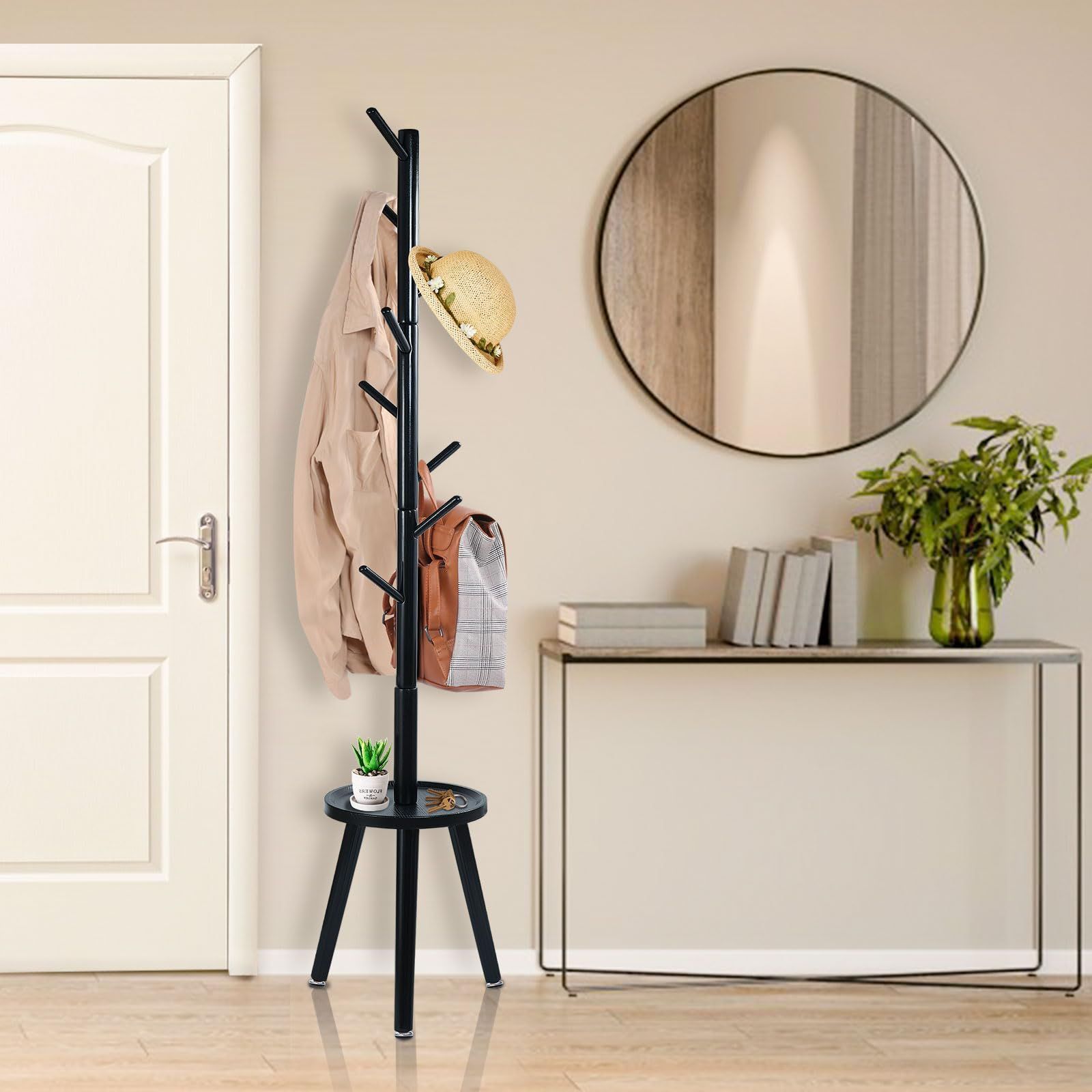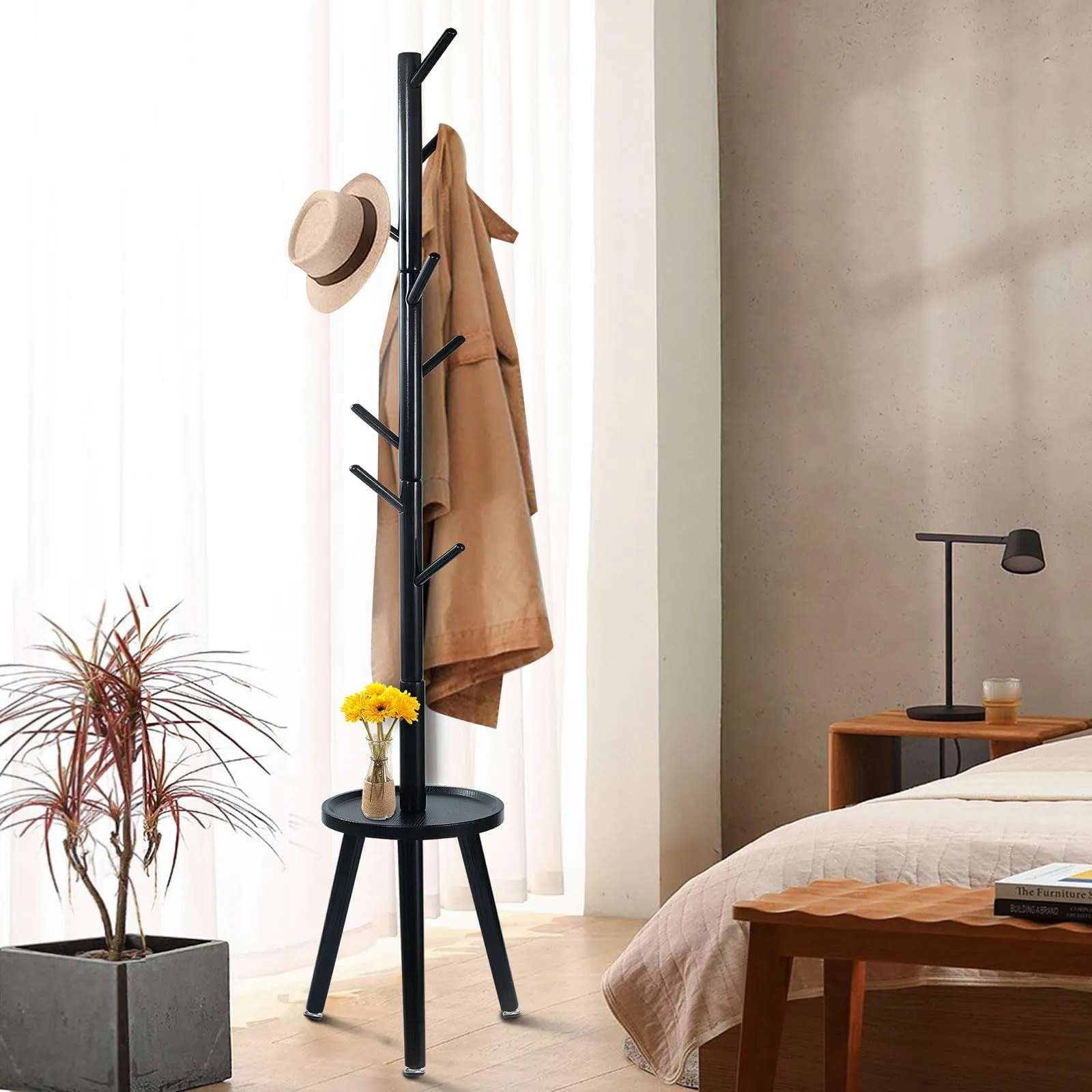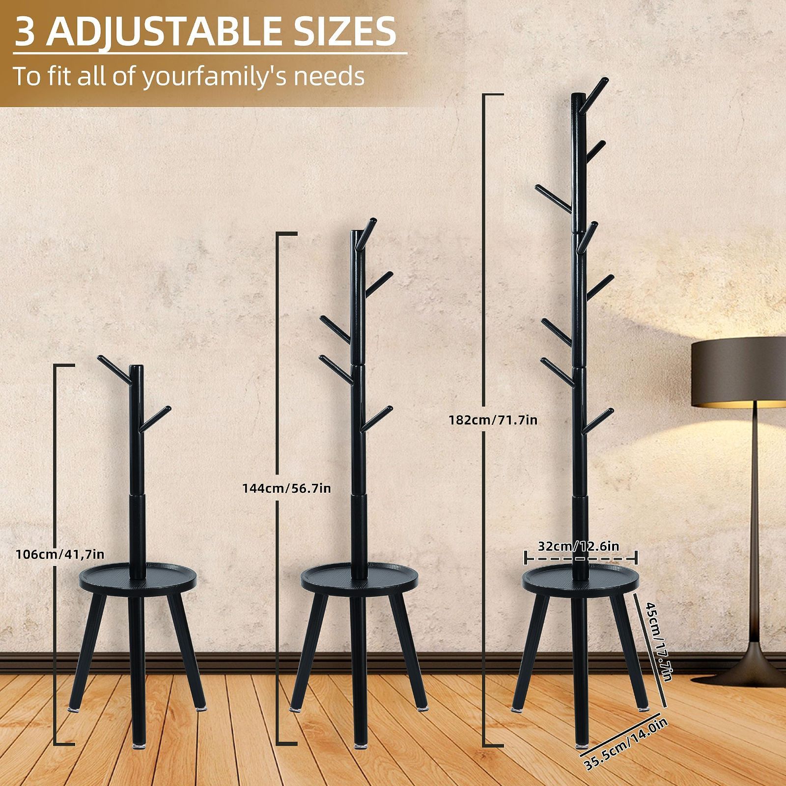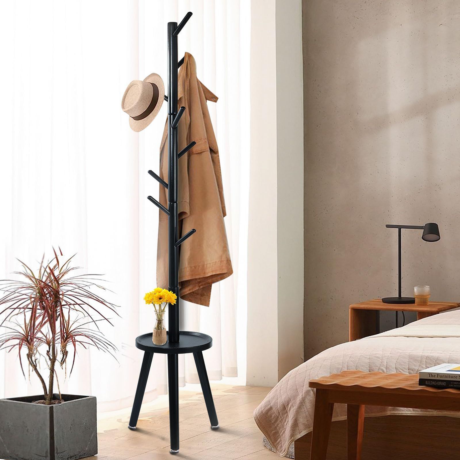 Yawinhe ポールハンガー 木製 コートハンガー コート掛け サイドテーブル付き 8つのフックがついたハンガーラック 3段高さ調節可能 高耐荷重 頑丈 枝型フック設計 倒れにくい 高さ182cm 組立て簡単 (ブラック)