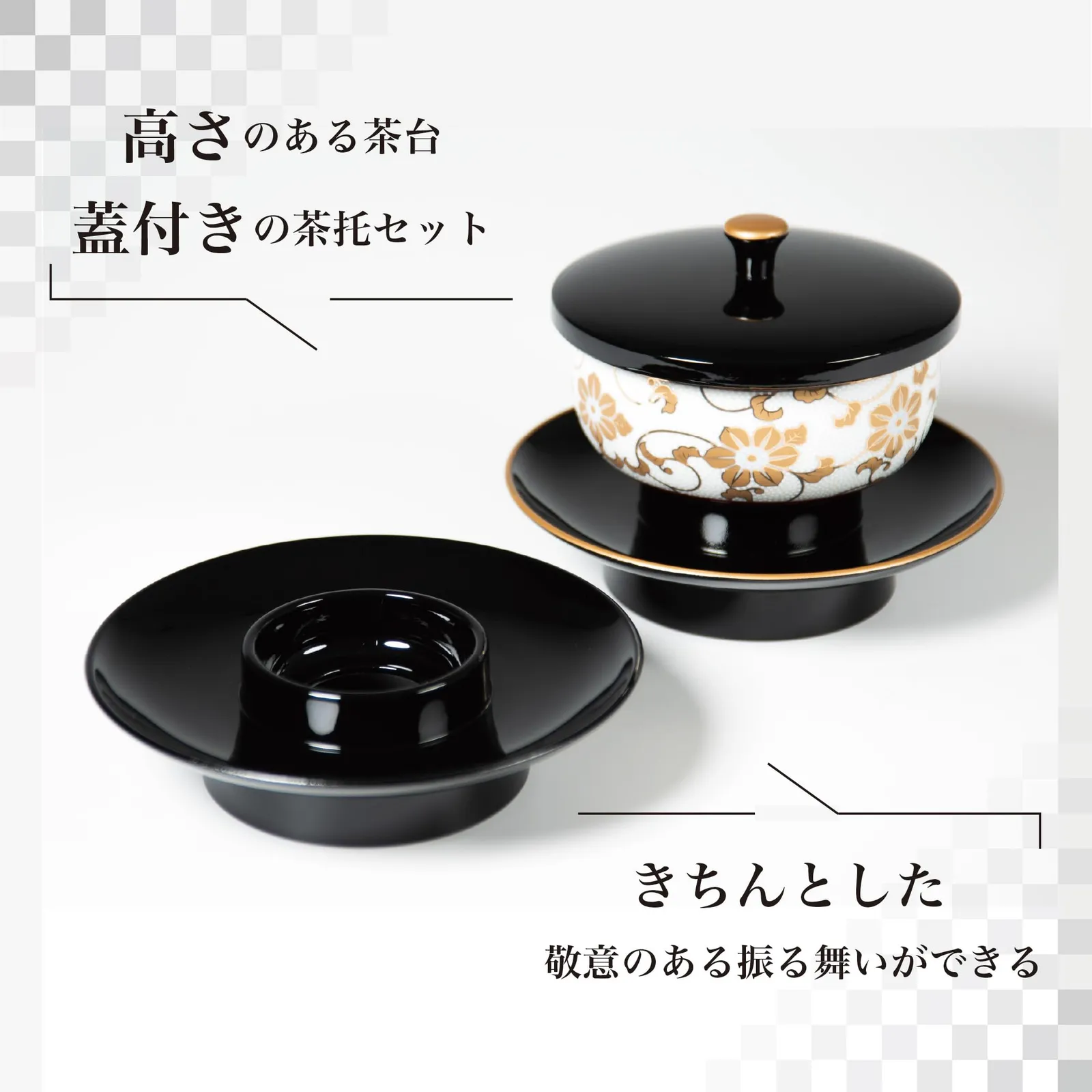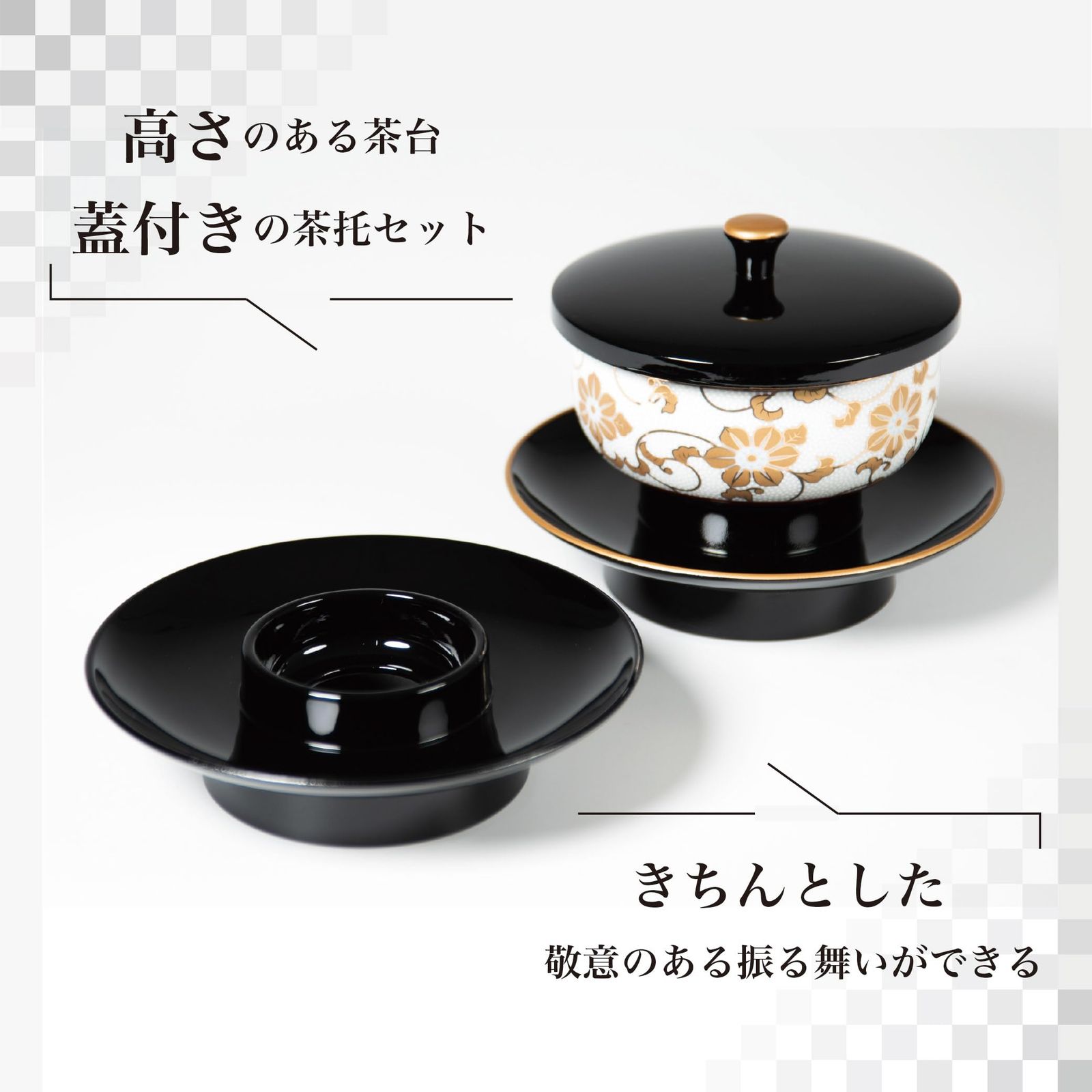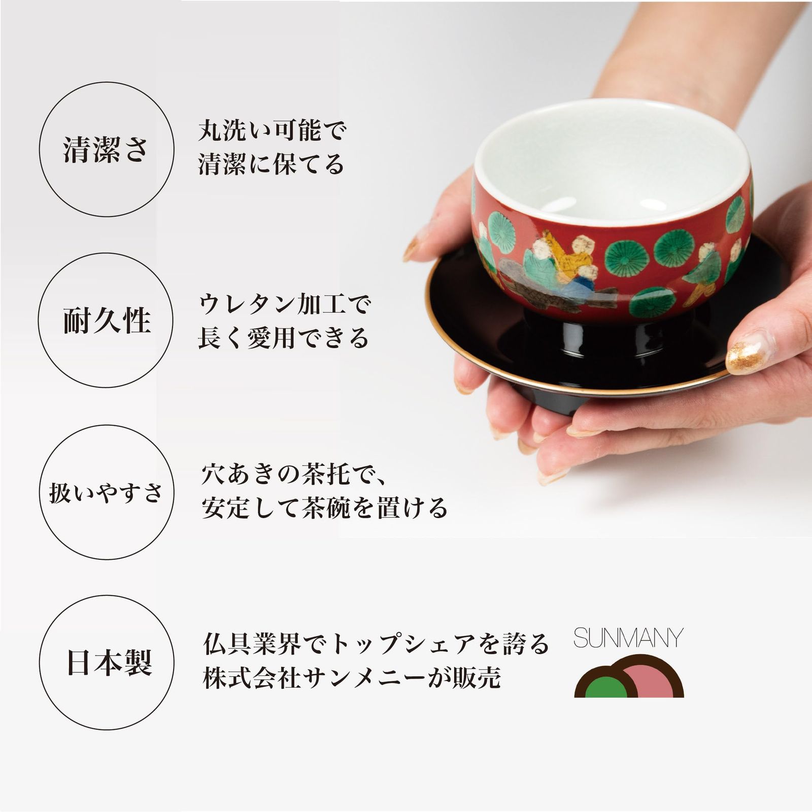 新着商品 サンメニー 本格 九谷焼 茶碗 付 茶台 茶托 山中漆器 日本製 お手軽 仏具 お盆 法事 に 定番 仏具 おちゃわん シンプル 供養 仏具 現代仏壇 お仏壇 仏具小物 4.2寸 黒 木米 毎日のお供え お参りに 手元供養 ペット 供養 小さな スペ
