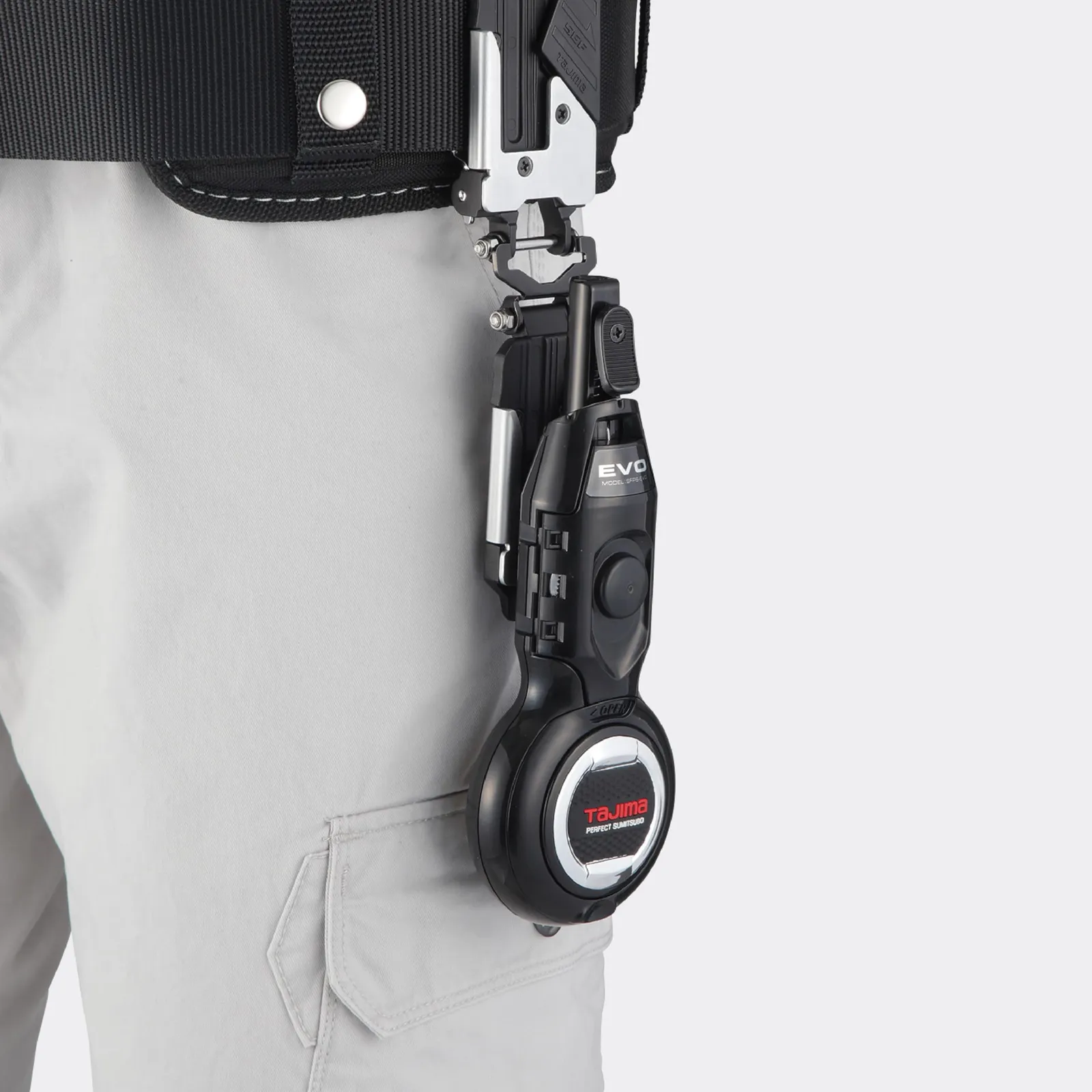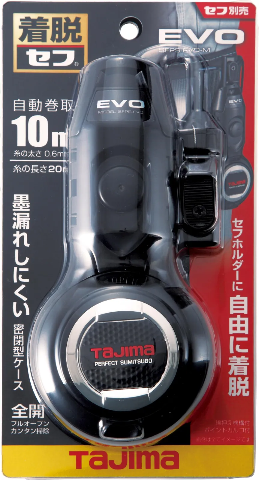 新着商品 タジマ セフシステム セフ墨つぼEVOM SFPS-EVO-MBK 丸型セフフック付で腰周りに装着可能 糸長さ20m /自動巻取10m 押さえやすく先端が見やすい斜めカットカルコケース採用 本体が工具なしで全開し手入れや糸交換が簡単 墨漏れしにくく墨