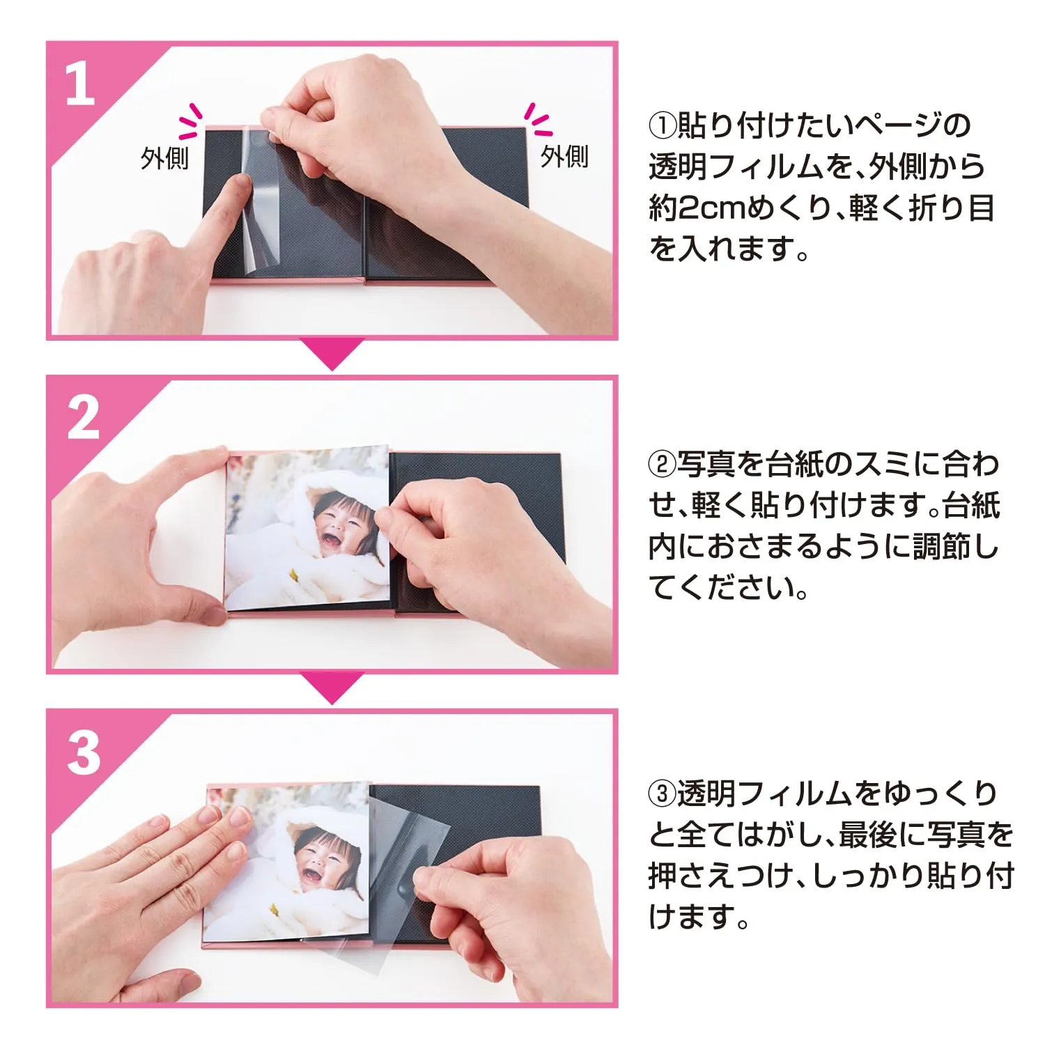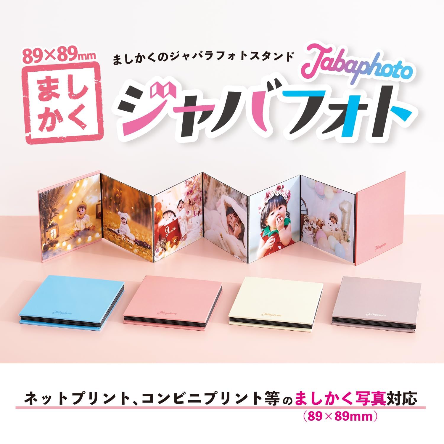 ○ましかく写真(89×89mm)12枚収容可能。○ジャバラ黒台紙(ドット糊):全12ページ(片面6ページ)○本体サイズ:H95×W91×D11mm(展開時:H95×W636mm)○カラー:4色(ライトブルー、ピンク、グレー、ホワイト)○日本製 ・ましかくサイズ(89×89mm)以外の商品は貼り付けないでください。台紙同士が貼りついたり、写真がはみ出て折れる恐れがございます。 ・台紙全面に貼った後は、写真を剥がすことはできません。