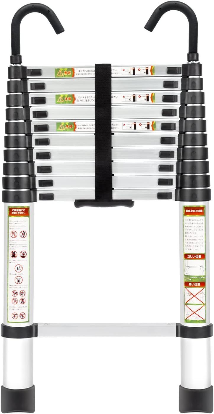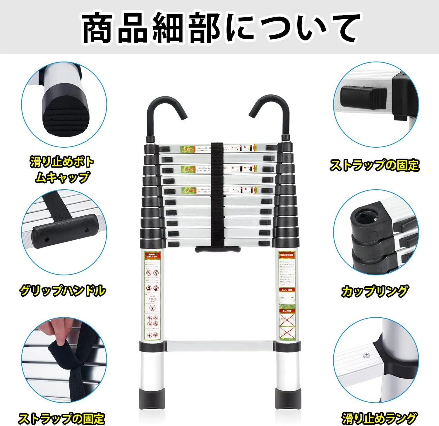 (W03シルバー3.2)伸縮はしご 耐荷重150kg 軽量 持ち運びやすい 折り畳み 伸縮梯子 多機能アルミはしご 自動ロック スライド式 伸縮自在 梯子 室内室外両用 スライド式 フック付き