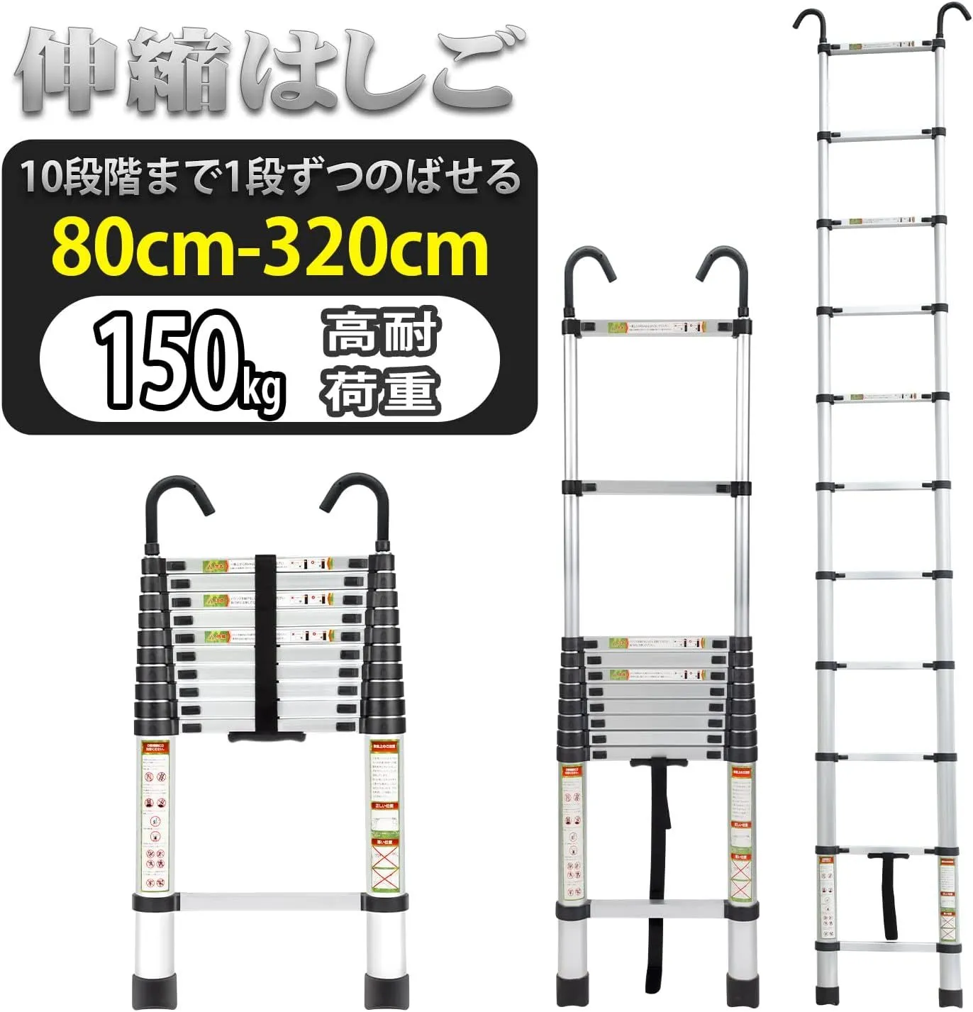 【サイズ詳細】3.2メートルタイプは折り畳み時サイズ(約):幅(足含む)46cm×奥行き7.5cm×高さ79.5cm 展開時サイズ(約):幅(足含む)46×高さ320cm 階段数量:ステップ10個(最上段を含めて11個)となっており、ステップの幅は各4cmとなっております。 重量:8.75kg 耐荷重:150Kg フックの長さは13㎝、重さは0.6㎏です。
