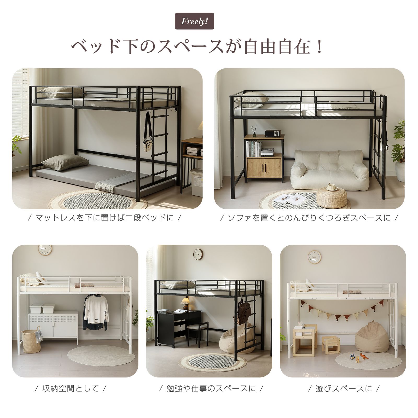 おしゃれで省スペース 間取りや気分に合わせていろいろな使い方ができます。 クローゼット・収納スペースに、別売りのシングルベッドを下に置けば二段ベッドに 、ソファを置くとのんびりくつろぎスペースに。限られた空間を素敵に演出できるロフトベッドです。