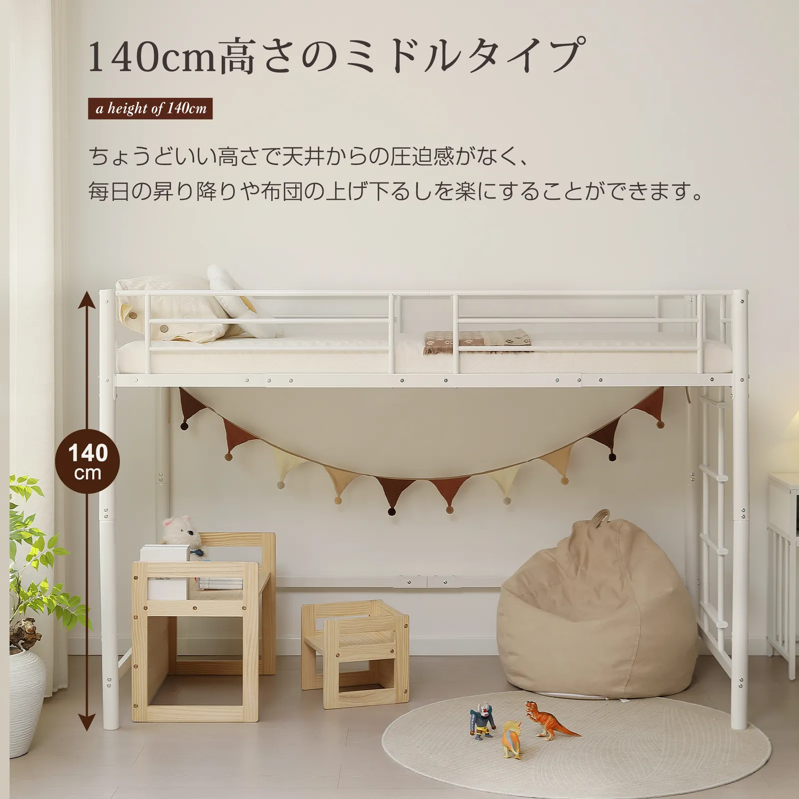 140cm高さのミドルタイプ ちょうどいい高さで天井からの圧迫感がなく、毎日の昇り降りや、布団の上げ下ろしを楽にすることができます。