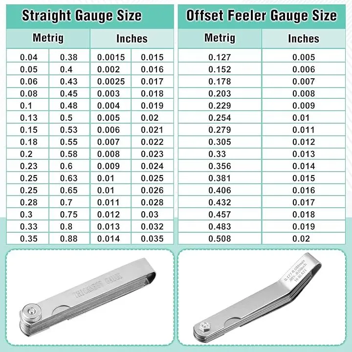 「セット内容」本セットには2種類の隙間ゲージが含まれます:32枚刃ストレートゲージ(0.04-0.88 mm/0.0015-0.035インチ)と16枚刃オフセットゲージ(0.127-0.508 mm/0.005-0.02インチ)。