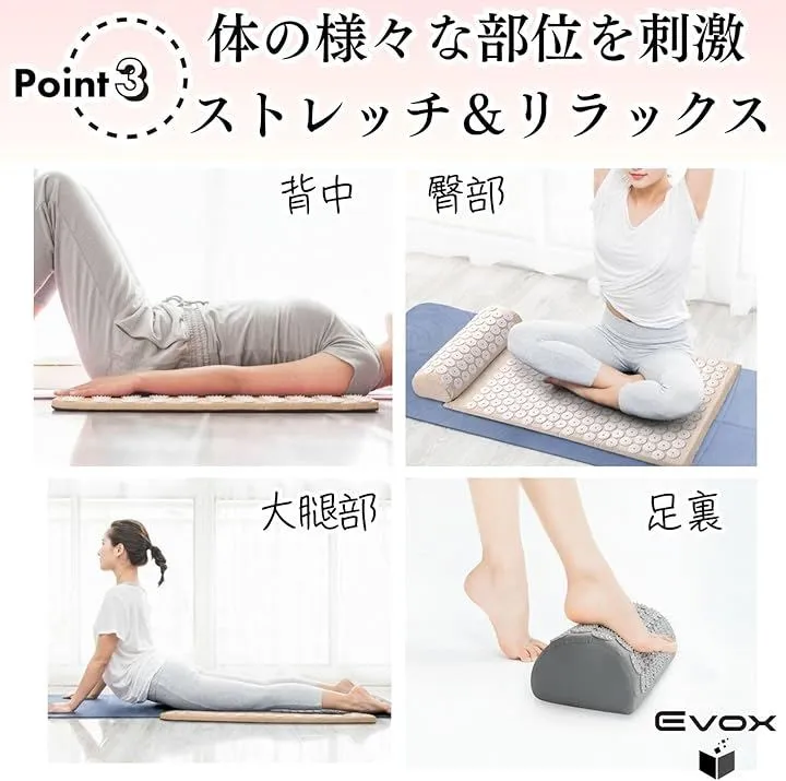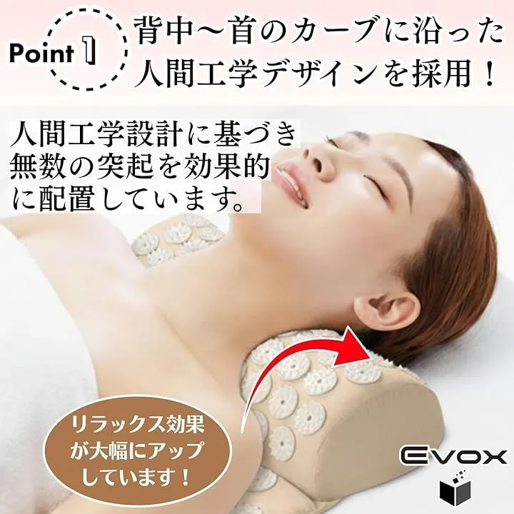 「快適なセルフケア」配置されたスパイクが特徴で、背中から首に沿うように広がり、横たわるだけでアキュプレッシャーを感じられるつくりです。