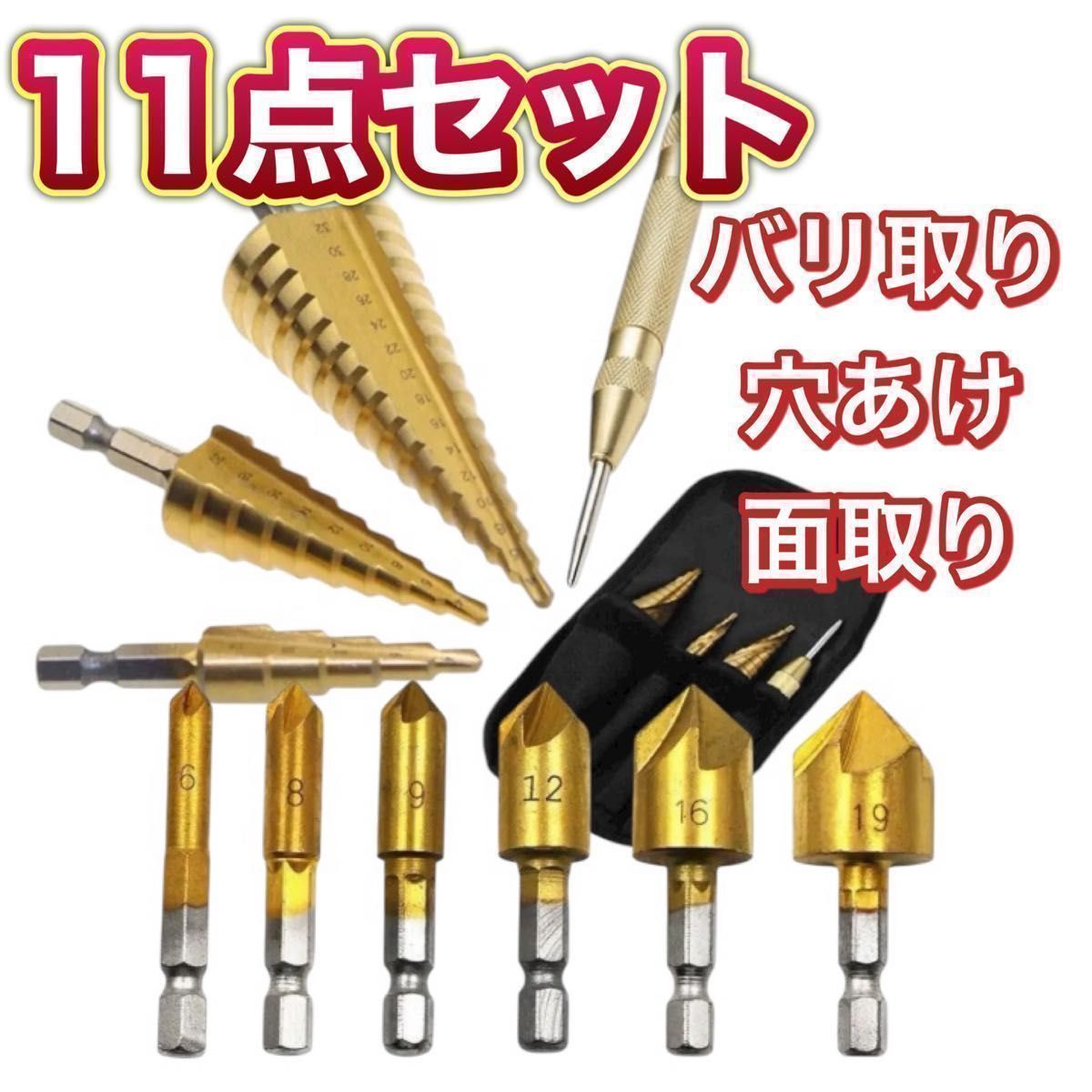 ステップドリル 11点 セット オートポンチ 面取りカッター バリ取り 穴あけ工具 チタンコート 電動ドリル対応 DIY 加工 六角軸 ケース付き