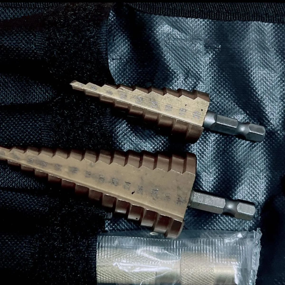 ステップドリル3本、面取りカッター6本、オートポンチ、専用ケースの11点フルセットです。