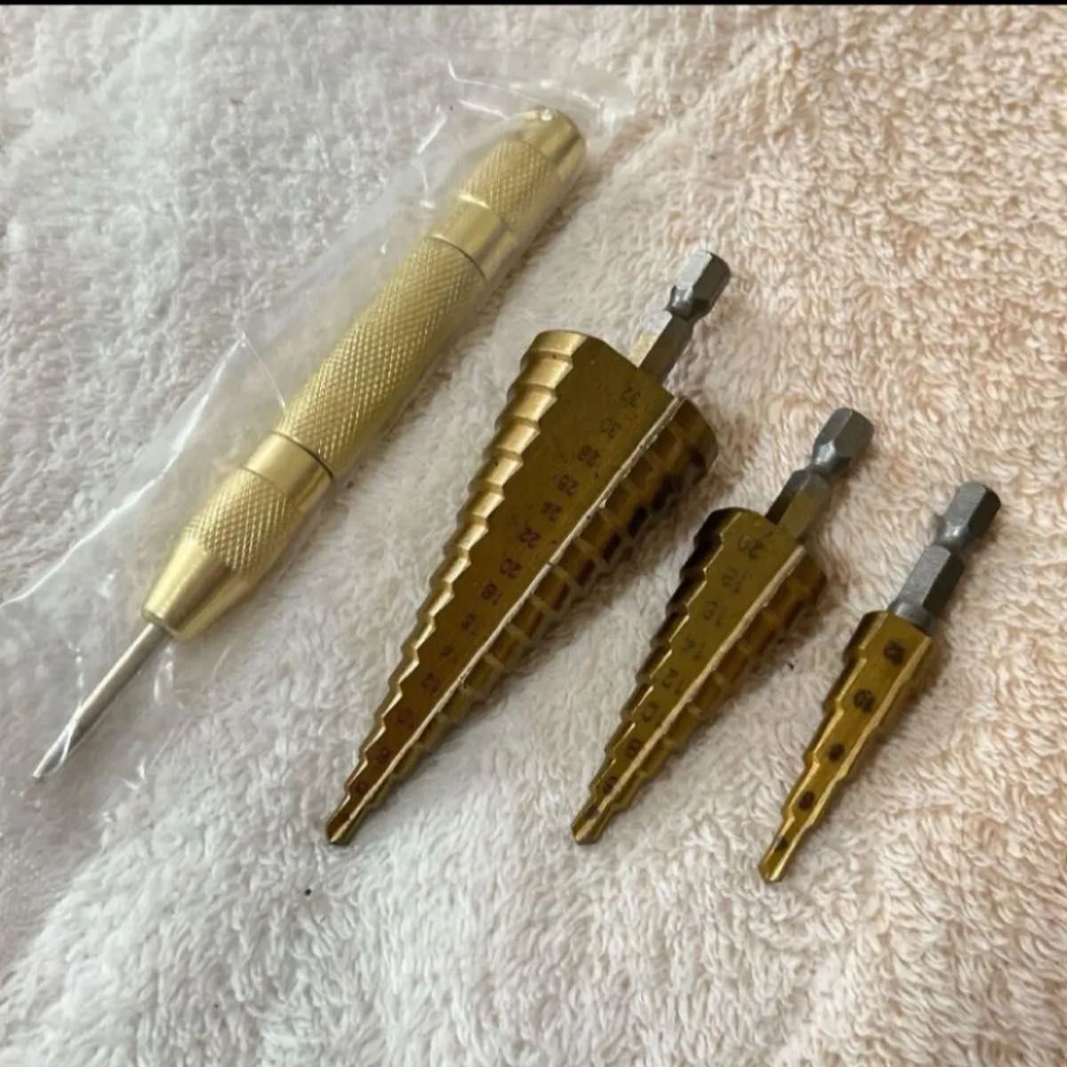 【セット内容】 ステップドリル 3本(4〜32mm対応) 面取りカッター 6本(6/8/9/12/16/19mm) オートポンチ 1本 専用収納ケース