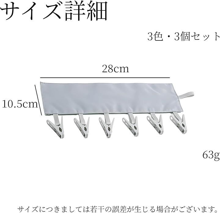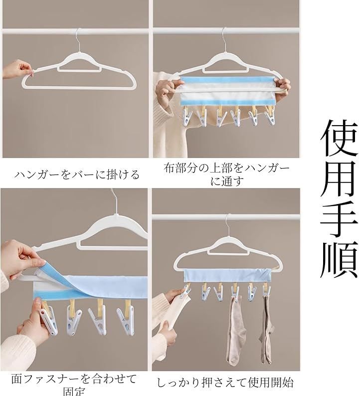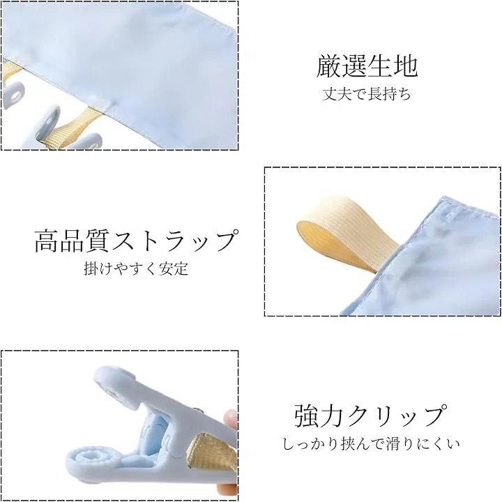 「商品特徴」(1)6つの洗濯ばさみ:マスクや靴下など小物が沢山干せる/(2)テープ付き:しっかり固定できてズレ落ちない/(3)高品質な素材:耐久性に優れた素材を使用