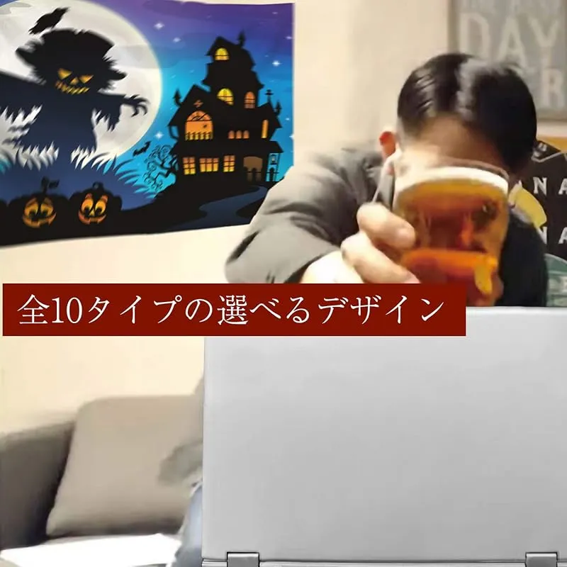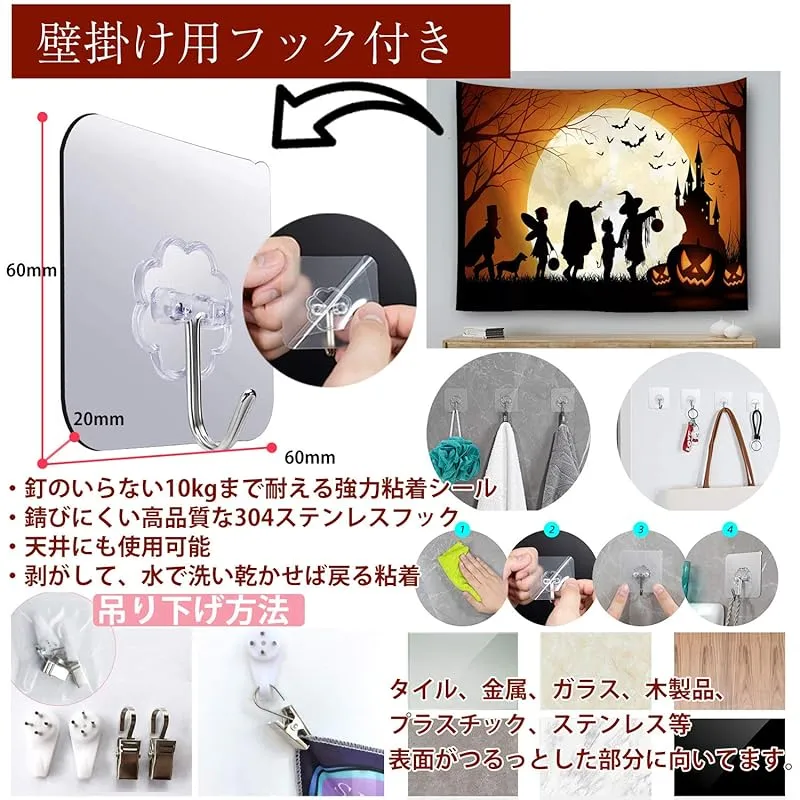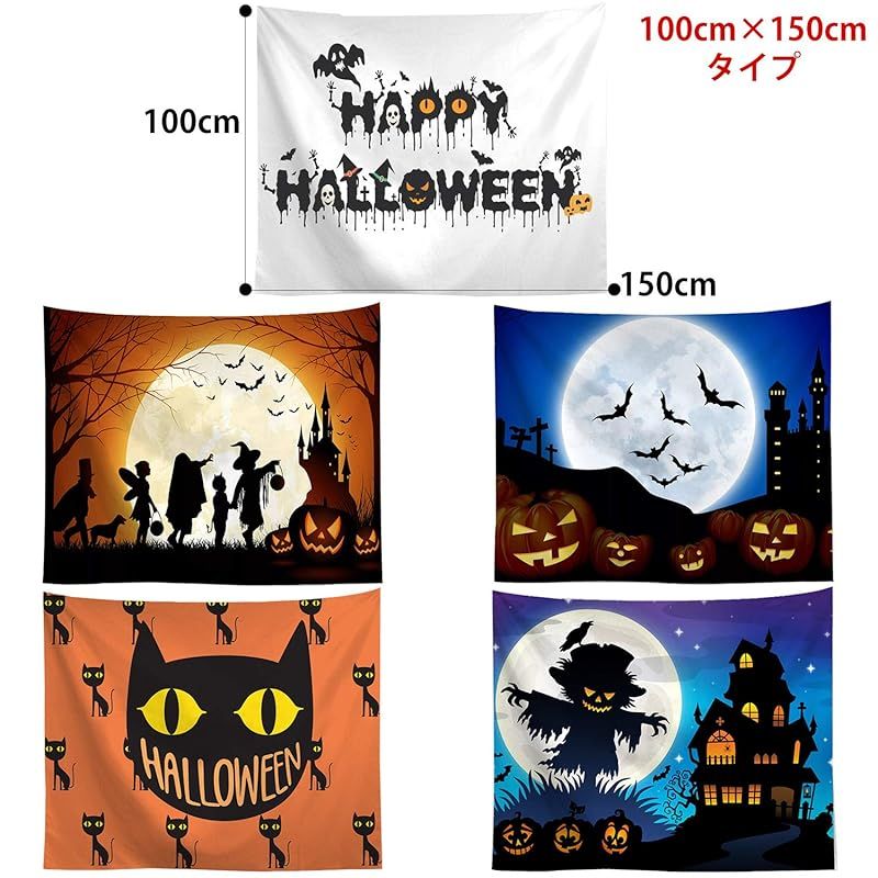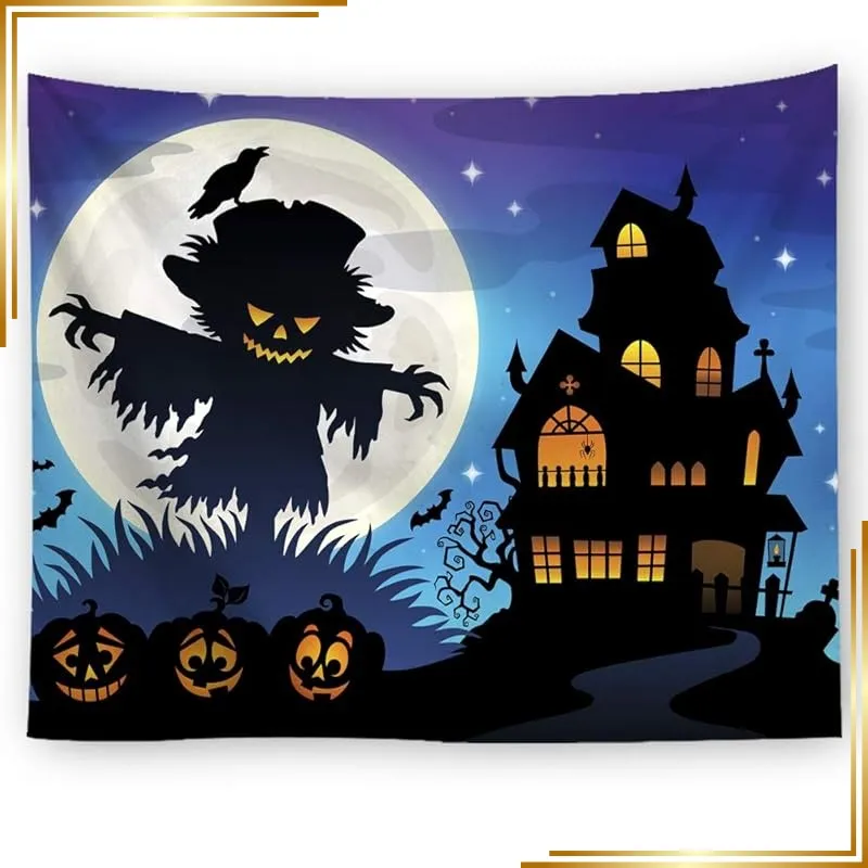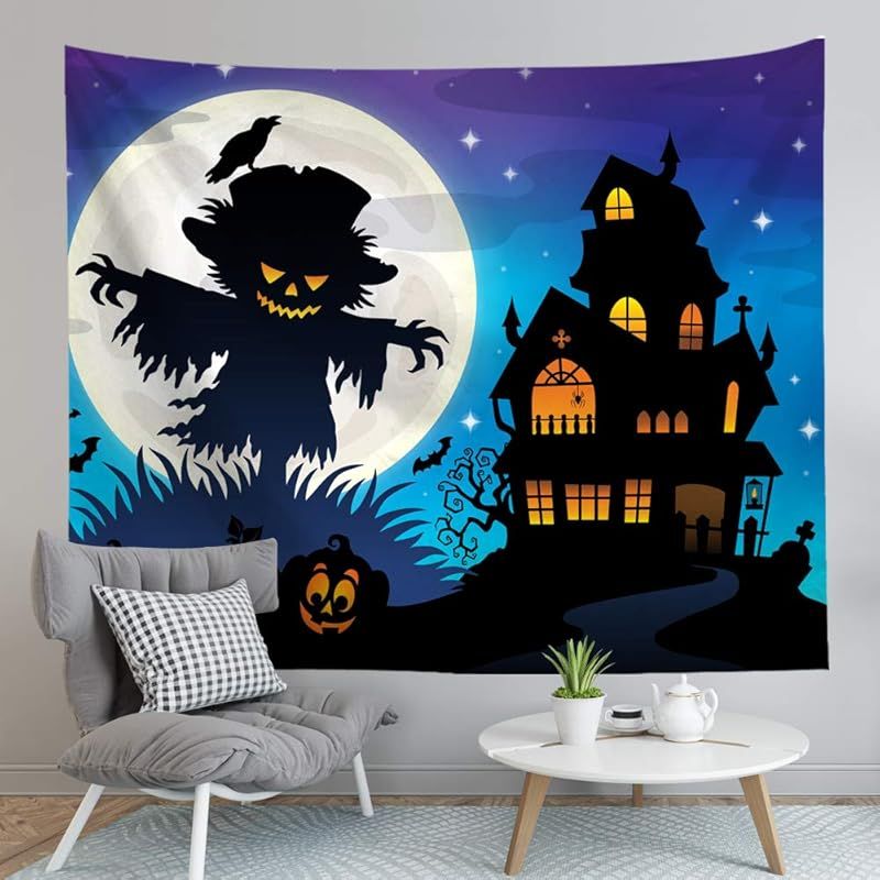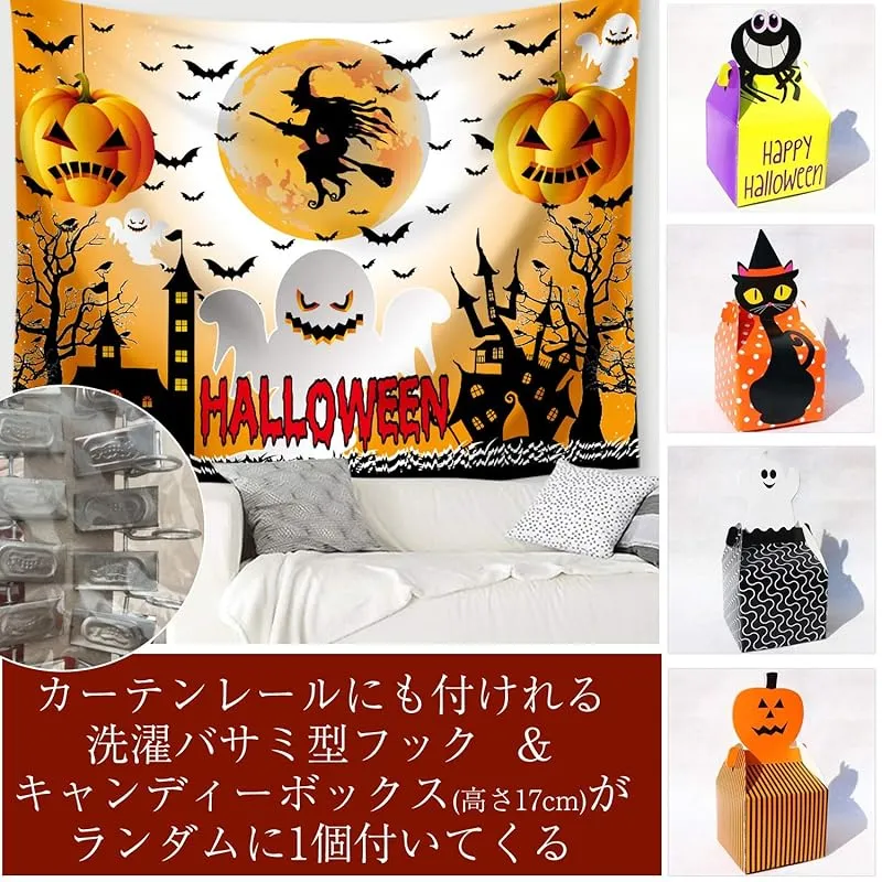 【新品】 e-Home ハロウィン タペストリー かかし 月 カカシ 150×100 cm 壁飾り ハロウィンタペストリー 洗濯バサミ型クリップ 吸着フック付き キャンディボックス(お菓子箱)付き パーティ Zoom 飲み会 会議 背景 バックグラウンド 1