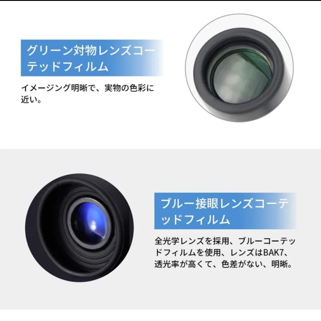 【くっきりした景色が見える】:表面反射によって、レンズの光透過率は低下してしまう恐れがあります。弊店の高倍率単眼鏡はコーティング光学レンズを採用、透過率を高めて、コーティングで大部分の波長の反射をおさえてくっきりした景色が見えます。