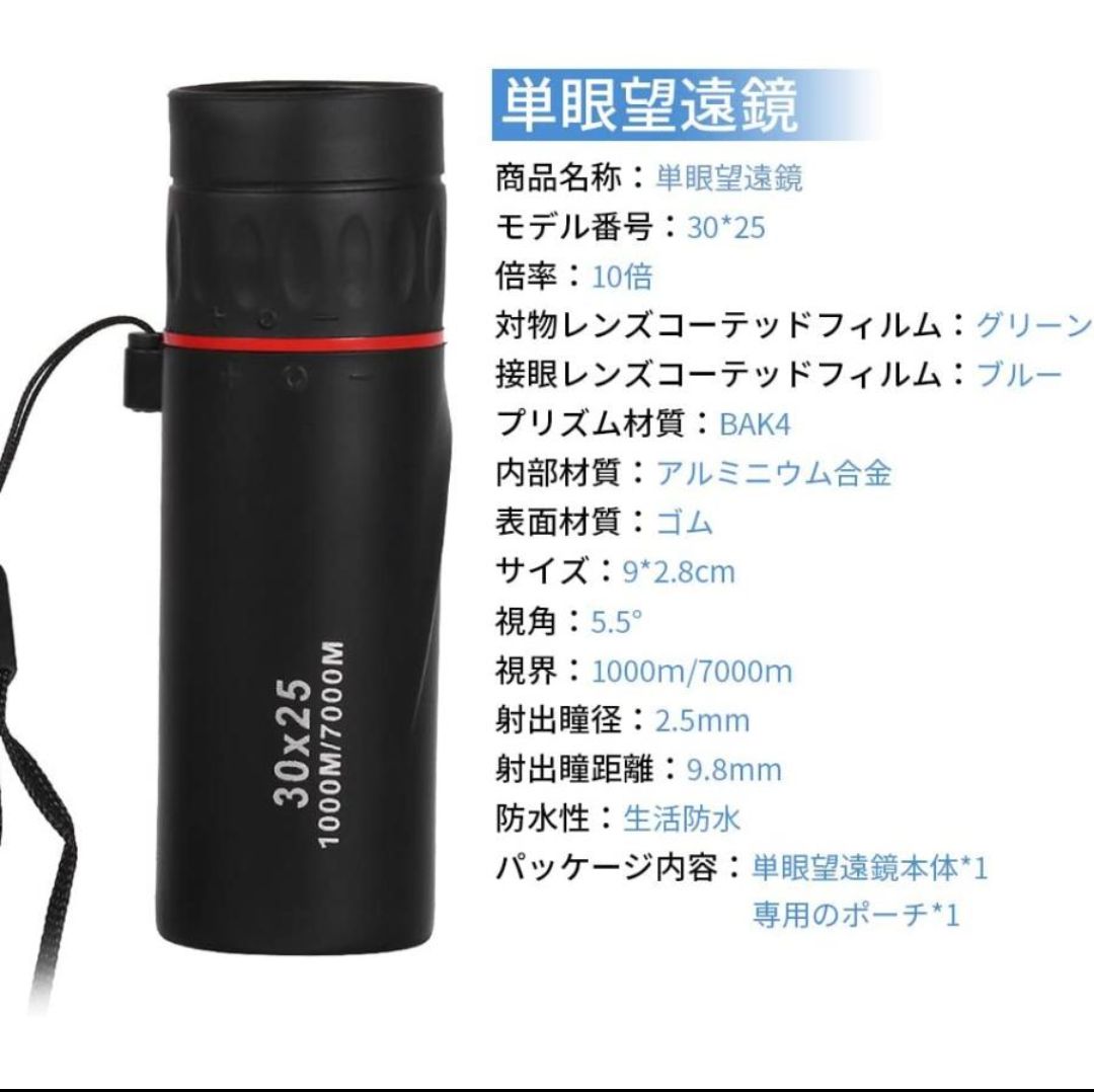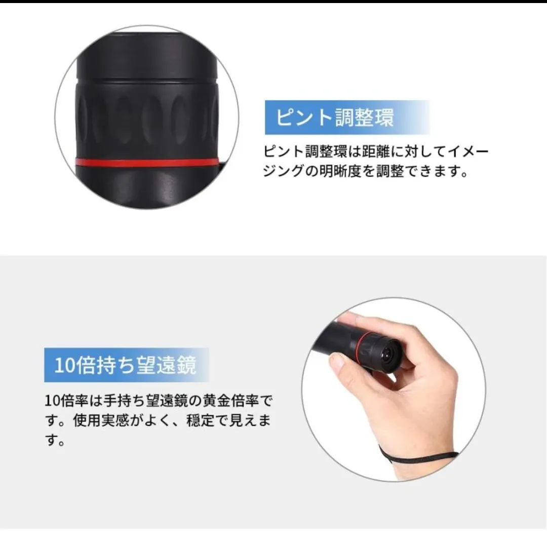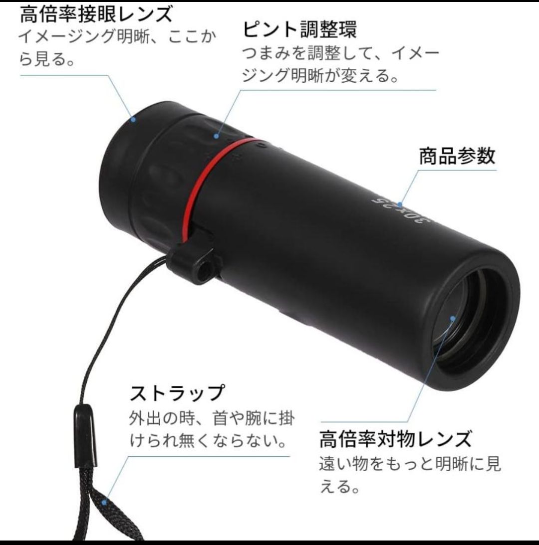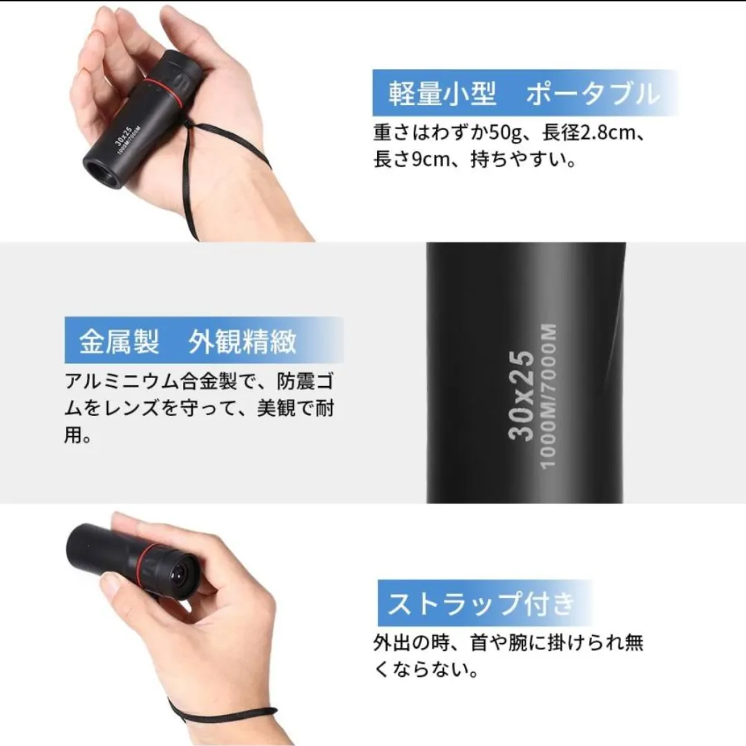 【目標物を追跡】:ピントを微調整することで目標物を追跡しましょう。旅行、登山、コンサート、天体観測、競馬、スポーツ観戦及び移動している動物の追跡に最適な望遠鏡です。ズームで山の景色を一望しましょう。 注意事項 *商品は新品ですが、輸入商品の為、多少、作りがあまい物、細かい傷があることがあります。ご了承ください。 *価格を抑える為に簡易包装での発送となります。 ※海外製品のため、細かなデザインなどは予告無く変更される場合がございます。お客様のイメージとの齟齬などは可能な限りないように務めますがよろしくお願い致します。 ※新品未使用にはありますが、海外製品かつ、安価のため日本製品に比べてどうしても細かな糸のほつれや裁縫の甘い部分が見られる場合はございます。 こちらも検品はしておりますが、 ある程度ご理解の上でのご購入をよろしくお願い致します。