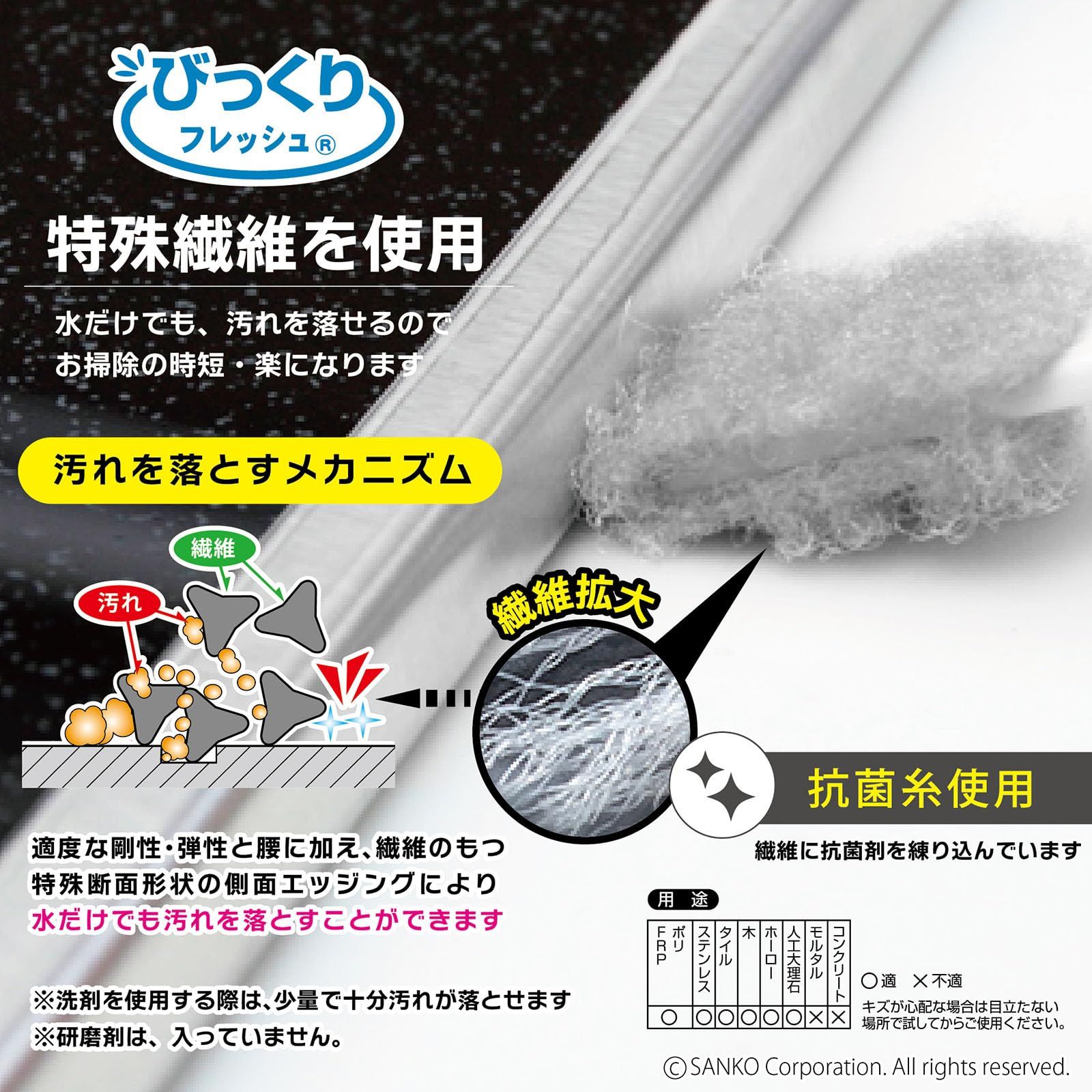 【びっくりフレッシュ(R)】水だけでも汚れが落ちる環境にやさしい商品です。洗剤を使用する場合でもごく少量で汚れが落とせます。