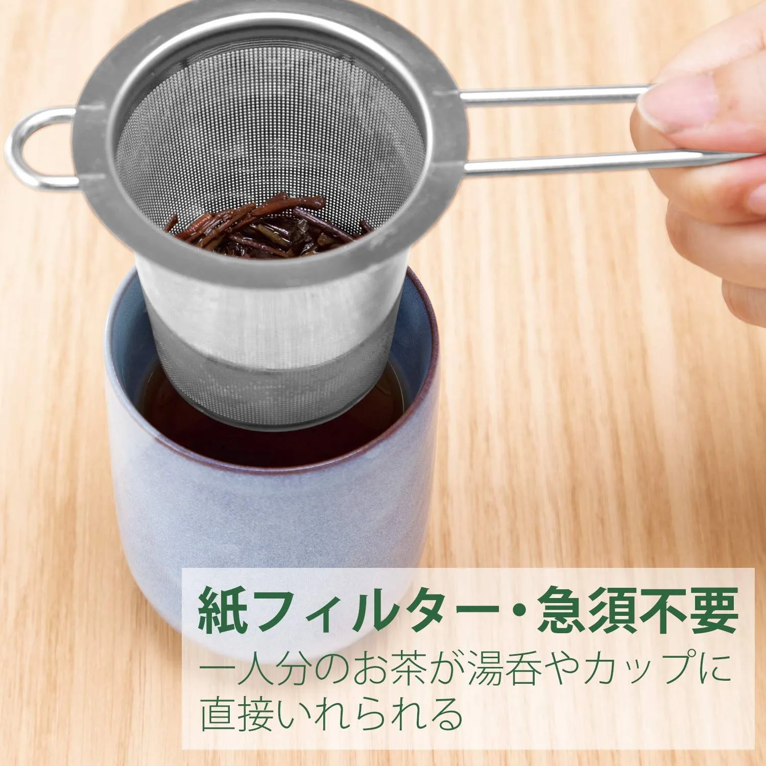 ●紙フィルター・急須いらず 急須がなくても湯呑みやコップのフチにそのまま掛けて、お手軽にお茶を入れられる 紙フィルター不要なので、エコ