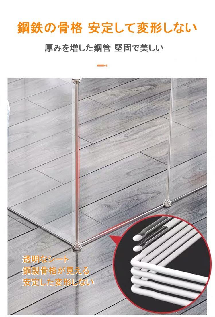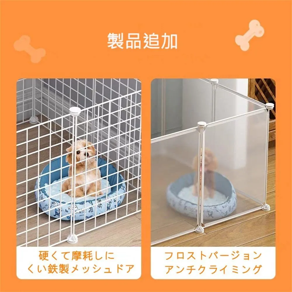 【3ステップの簡易組み立て】コネクターにジョイントして結束バンドで留めるだけ。正方形、長方形、L字型等、お好みの形にレイアウトできます. ※設置するお部屋や用途に合わせてお好みの形にジョイントできるペットサークルです。 ※正方形、長方形、L字型等、お好みの形にレイアウトできます。 ※テレビやAV機器の保護、玄関や階段への出入り防止、棚や仕切りなど様々な用途でご使用できます。 汚れたり水がこぼれてしまっても簡単に拭き取ることができます。 中からも外からも周りの様子が見えるのでペットも飼い主様も安心です。 ※ペットが出入りしやすいドア付きのパネルが1枚付属されています。 ※また、ドアが外側に開く向きで取り付けてください。 ※プラスチック製で汚れても丸洗いできる 汚れやニオイが気になったら手軽に丸洗いできる、錆びつく心配のないプラスチック製のケージです。 ※「パネル」を組み合せて構成されているから組み替え、拡張、リペア、が簡単にできます。 組み換え-- 扉、パネルの位置を変える、細長の構成にする等、ペットフェンス 内でのパネル毎の組み換え、配置がパネル構成の範囲内で可能です。 拡張-- 成長したので、1頭増えたので、ペットフェンス広くしたい場合、別売のパネルを追加すれば拡張が簡単に可能です。 リペア--汚損・損耗した場合、丸ごとではなくパネルごとに入れ替えることが出来るので永続的な使用が出来ます。 ※商品仕様:11枚 x 透明なPPパネル(幅35 × 高45㎝) パネルサイズ:45×35cm(1枚) 1枚 x 金属網状ドアパネル(幅35 × 高45㎝) 24個 x ジョイントコネクター バックル 40本 x 結束バンド 1本 x 木槌 最後までご確認頂き誠にありがとうございました。 上記をご確認頂き、ご購入いただけましたら幸いです。 何かご不明な点がございましたらお気軽にメッセージからお問い合わせ下さい。