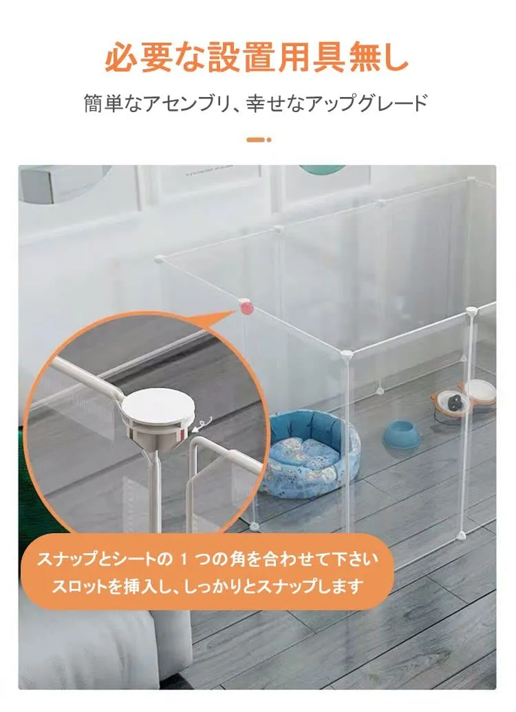 【軽量なプラスチックパネル、ペットの様子が見える】半透明のパネルを組み立てると、ペットの姿を一目で確認できるフリースペースが完成。パネルは軽量なプラスチック製のため、力仕事が苦手な人でも扱いやすいですよ. √