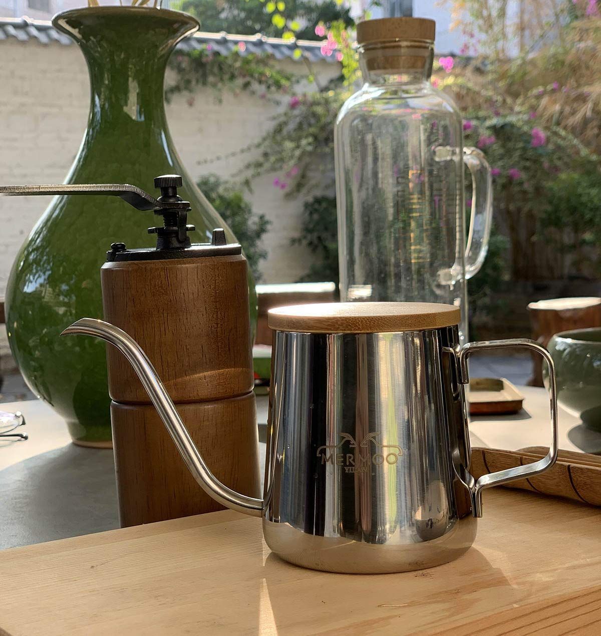 【握り心地の良いコーヒーポット】この人気のMERMOO YILANドリップポットのハンドルは、人間工学的なデザインにマッチしており、握り心地が良く、水を注ぐ際の流れの安定性を高めています