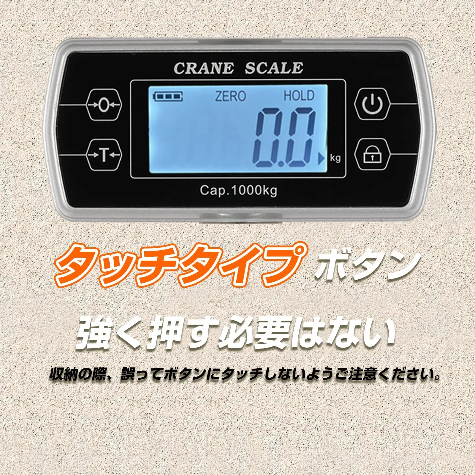 【タッチタイプボタン】製品改良の一環として、このクレーンスケールはタッチスタイプボタンを採用しています。強く押す必要はありません。収納の際、誤ってON/OFFボタンにタッチしないようご注意ください。 ※