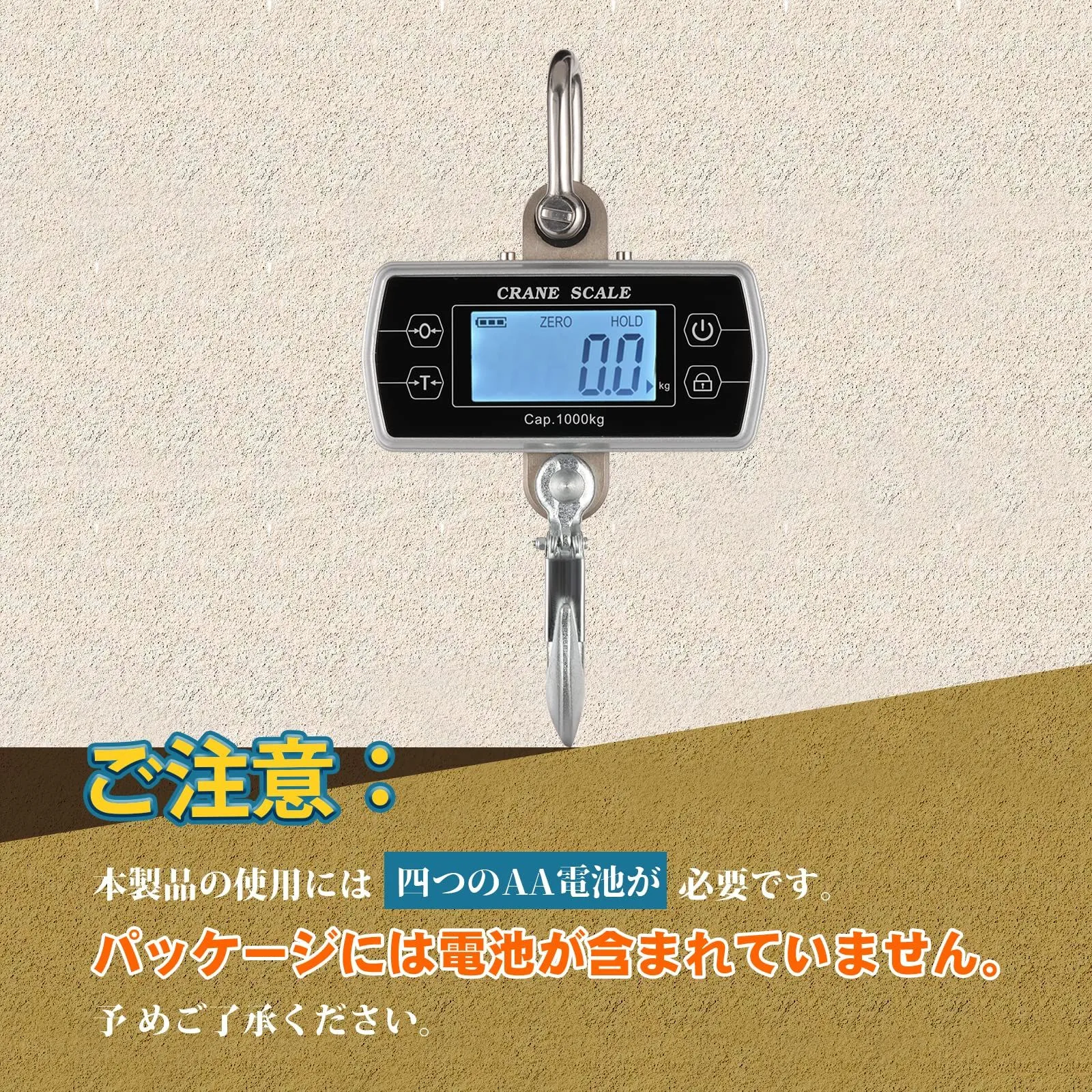 【乾電池式】このデジタル吊りはかりは乾電池式です。四つのAA電池で使用できます。電池は別売りです。充電式の吊りはかりより乾電池式の方が使いやすいです。しかし、海上運送の制限により、電池は別売りです。予めご了承くださいますようお願い申し上げます。 ※