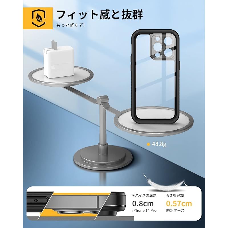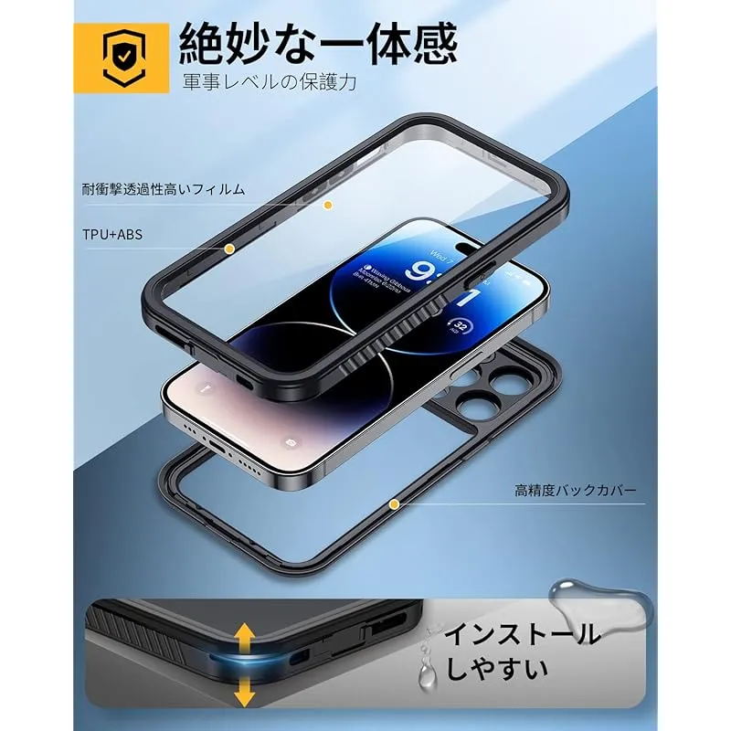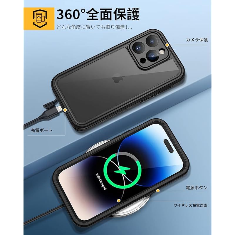 【強防衝撃力・360°保護】軍用MIL規格810G-516防振材料が採用されていますので、衝撃にとても強いです。防水ケースの嵌め込み式前カバーと透明バックカバーの組み合わせにより、360°全方位からiPhone 14 proを保護してくれます。落下、衝撃、擦れ傷など一切心配ありません。粉塵も中に入らない、砂や埃が舞う過酷な環境でも端末をしっかり包んで保護します。