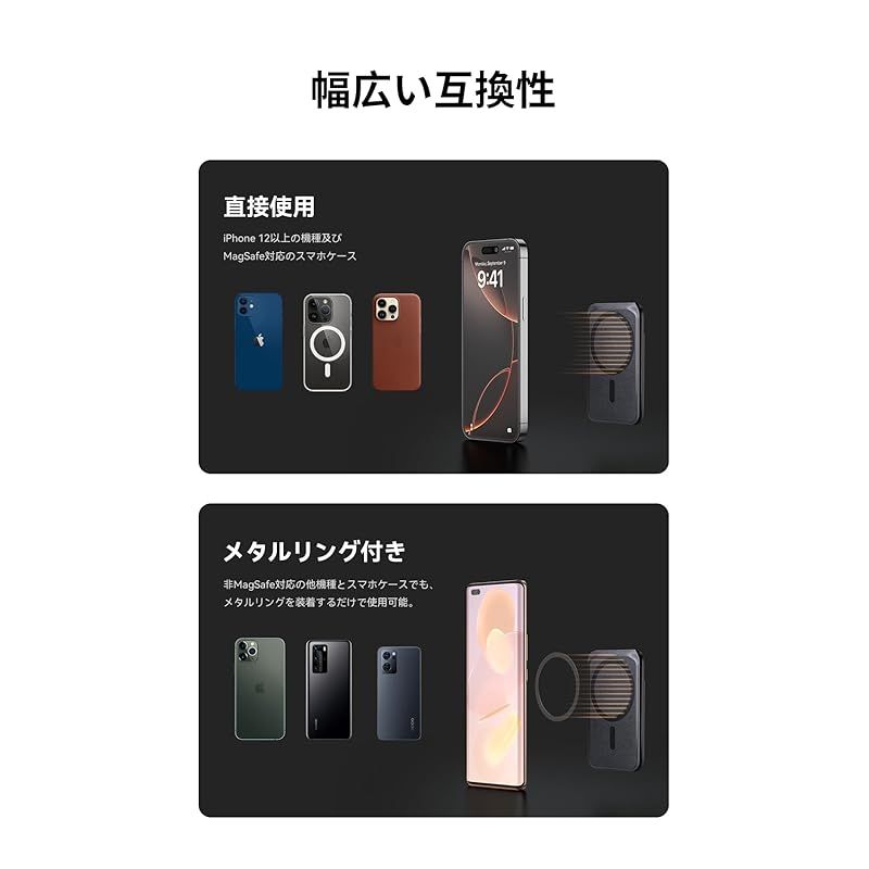 【ピタッと強力吸着!N52磁石】N52ネオジム磁石を採用したリング状マグネットにより、最大約1.5kgを保持する強力な吸着力を実現。スマホを貼るだけで確実に固定され、歩き回ったり、スタンド使用中でも外れない安心感があります。iPhone17/16/15/14/13/12シリーズだけではなく、MagsafeスマホケースやMagsafe機能付けのスマホも対応できます。非MagSafe対応の他機種でも、付属のメタルリングを装着するだけで使用可能。