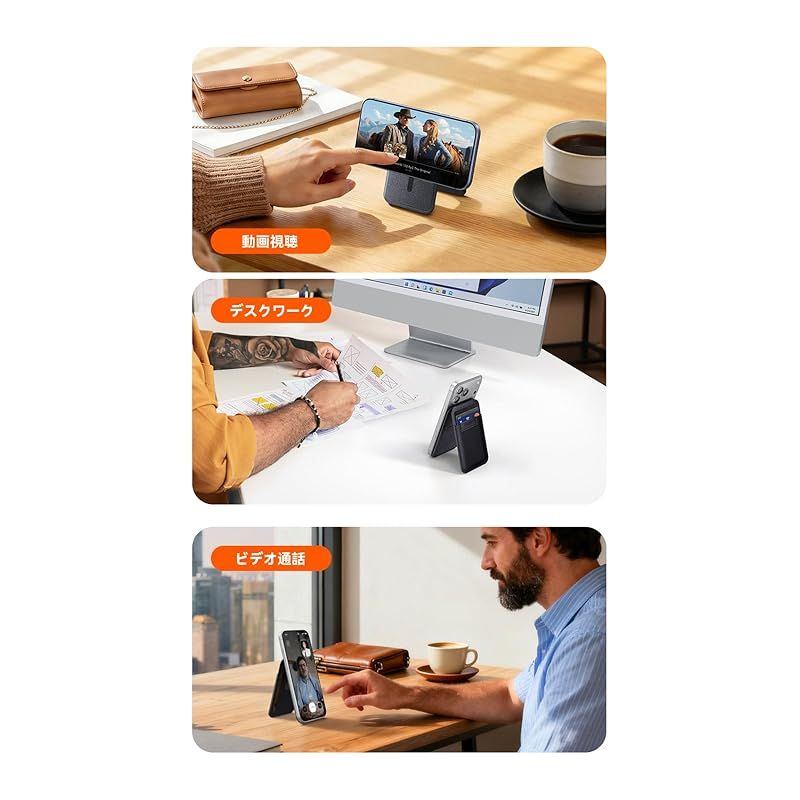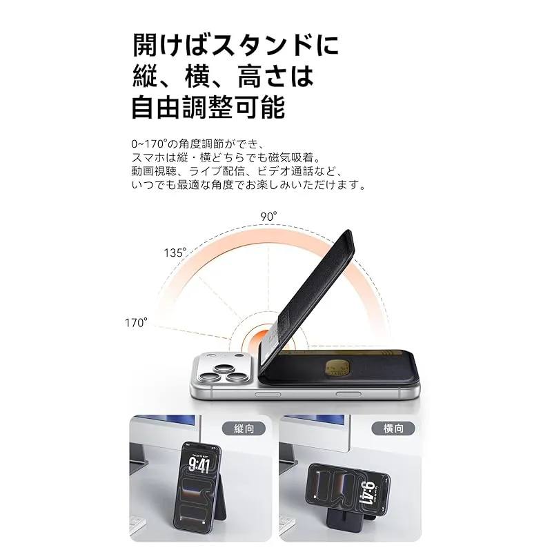 【MagSafe対応 カードケース&スタンド】カードケースとスタンドが一つにする2-in-1多機能マグネットウォレット。これ一つで、動画視聴やオンライン会議はもちろん、お財布代わりに外出可能。毎日の荷物を驚くほど軽く、シンプルにします。