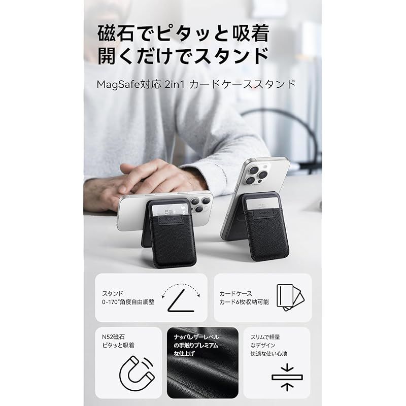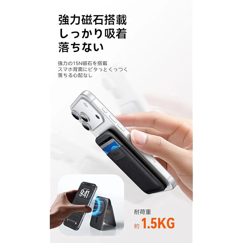 【商品説明】 カードケースとスタンドが一つにするMcdodo 2-in-1多機能マグネットウォレットです。これ一つで、動画視聴やオンライン会議はもちろん、お財布代わりに外出可能。毎日の荷物を驚くほど軽く、シンプルにします。フレキシブルなゴムバンドで作られた外側と内側に3つのカードスロット、容量は通常のカードケースより多い。交通カード、クレジットカード、名札、カードキー、写真、現金など、約6枚の常用カードを収納できます。従来の財布の代わりとして、スマホ+カードケースだけで、手軽にお出かけ、いつでも気楽に取り出して使用できます。スタンド部分が0度から170度までスムーズに開閉。スマホは縦向き・横向きどちらでも吸着可能。食事中やデスク上など、様々なシーンに合わせて最適な角度に調整でき、ハンズフリーで、動画視聴、ライブ配信、ビデオ通話などを楽しめます。N52ネオジム磁石を採用したリング状マグネットにより、最大約1.5kgを保持する強力な吸着力を実現。スマホを貼るだけで確実に固定され、歩き回ったり、スタンド使用中でも外れない安心感があります。iPhone17/16/15/14/13/12シリーズだけではなく、MagsafeスマホケースやMagsafe機能付けのスマホも対応できます。非MagSafe対応の他機種でも、付属のメタルリングを装着するだけで使用可能。多機能ながら極薄デザインにこだわりました。ポケットや小さなバッグにもすんなり収まり、スマホに装着しても違和感のない快適な握り心地。高級車にも使われるナッパレザーのようなプレミアムな質感と滑らかな手触り。その軽さ、薄さ、手触りを、一日中忘れてしまうほどです。