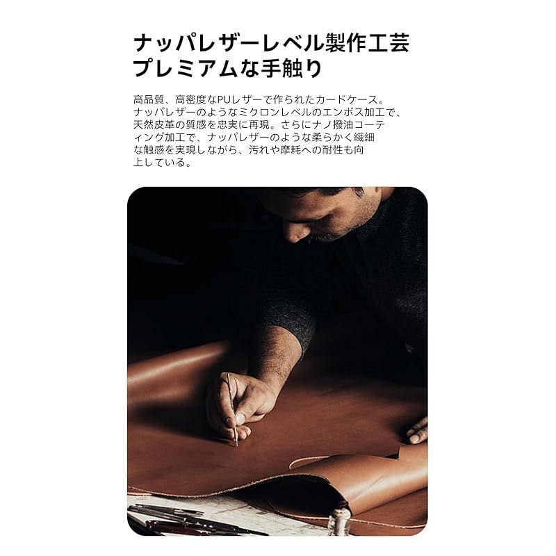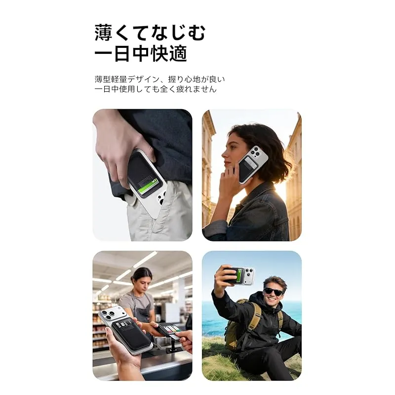 【薄く軽くて手になじむ!一日中の快適な手持ち感】多機能ながら極薄デザインにこだわりました。ポケットや小さなバッグにもすんなり収まり、スマホに装着しても違和感のない快適な握り心地。高級車にも使われるナッパレザーのようなプレミアムな質感と滑らかな手触り。その軽さ、薄さ、手触りを、一日中忘れてしまうほどです。