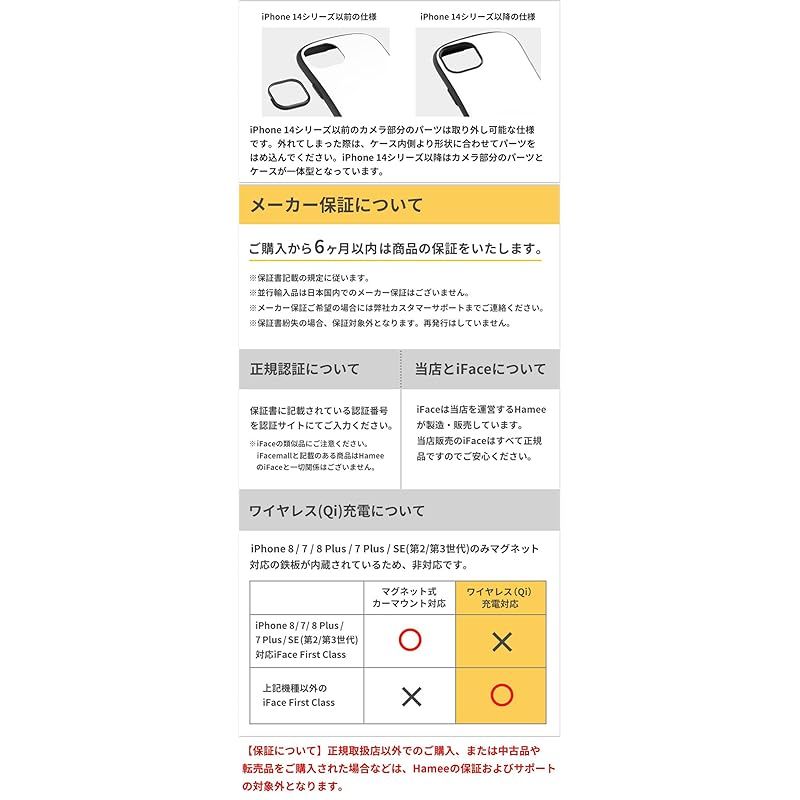 ●8/7/SE(第2/第3世代)用のケースはワイヤレス充電には対応しておりません。 商品仕様 13用:約縦16.3×横8.2×厚1.2 cm、重量約53g 15・14・13用主素材:ポリカーボネート、TPU ストラップ装着:可 15・14・13用ワイヤレス充電:可 :有