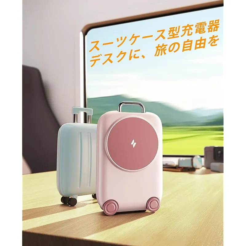 【人気プレゼント&安心の日本語サポート】自分用はもちろん、ギフトにも最適です。スーツケースをモチーフにした遊び心のある佇まいで、置いた瞬間に目を引き、思わず誰かに贈りたくなる一台です。パッケージ内容:3in1ワイヤレス充電器本体、20W USB-C急速充電アダプター、1.5mのロングケーブル、取り扱い説明書。環境に配慮した素材設計と18ヶ月の製品で、長く安心してお使いいただけます。