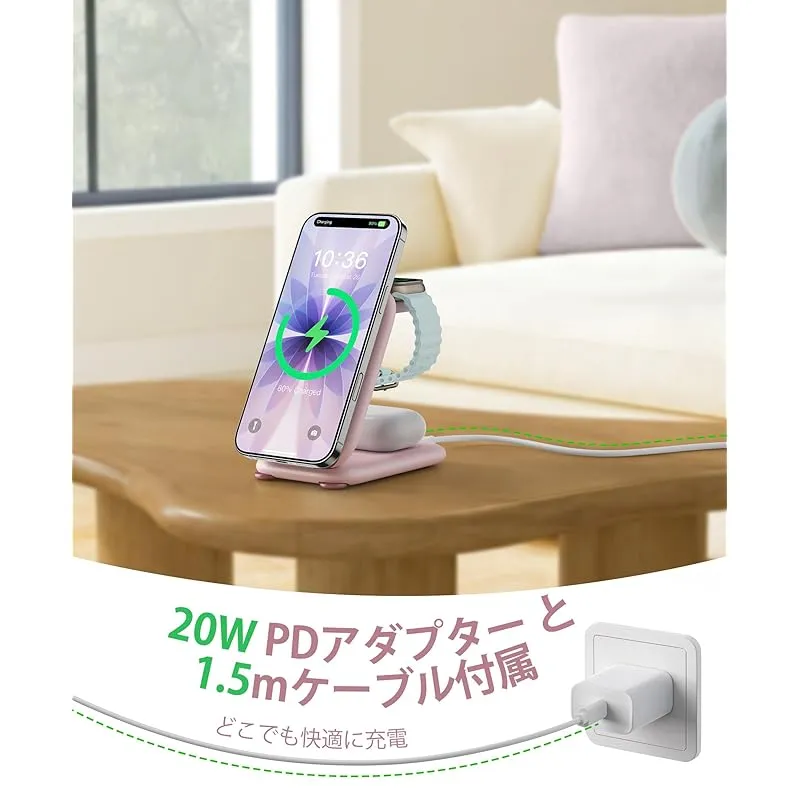 【20W USB-C充電器+1.5mケーブル付き】 iPhone/Apple Watch/AirPods対応 3台同時充電 角度調整可能 マグネット式 旅行 製造元:Shenzhen Dixib Technology Co.,LTD