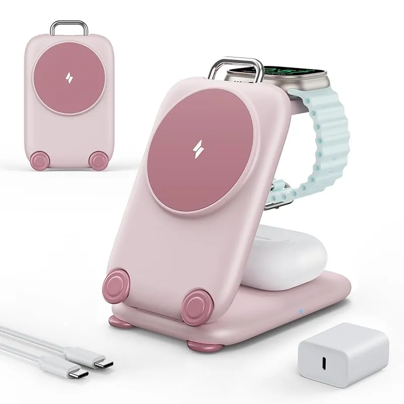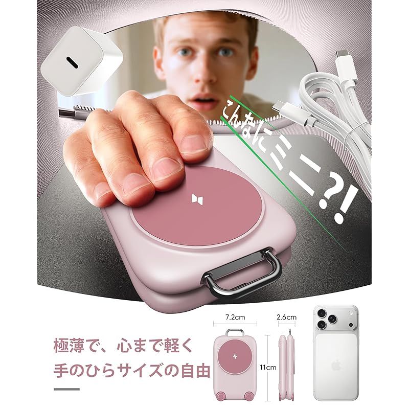 【旅の自由をデスクに。極小の3in1ワイヤレス充電器】「旅するように、毎日を軽やかに過ごしたい」という想いから生まれた、スーツケースをモチーフにした3in1 MagSafe充電スタンドです。iPhone・Apple Watch・AirPodsをこれ1台で3台同時に充電でき、充電器や煩わしいケーブルをまとめて、デスク周りをすっきり整えます。極小・省スペース設計で、ベッドサイドやオフィスデスクにも置きやすく、自宅でもオフィスでも旅先でも自然になじむ、ミニマルでスタイリッシュなワイヤレス充電器です。 ?