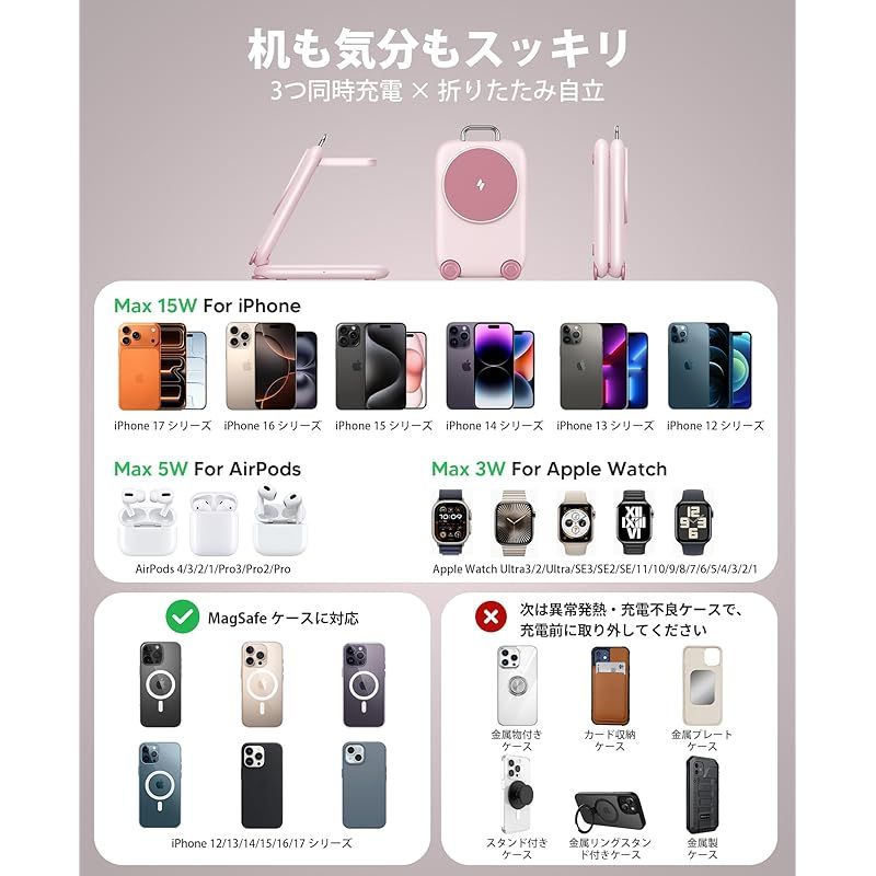 【 幅広い互換性 】磁力吸着は以下の機種に対応:iPhone 17/17e/17 Air/17 Pro/17 Pro Max/16/15/15 Pro/15 Plus/15 Pro Max/14/14 Pro/14 Plus/14 Pro Max/13/13 Pro/13 Pro Max/12/12 Pro/12 Pro Max。Apple WatchはSeries 11 / 10/9/8/7/6/5/4/3/2/SE/SE2/SE3/Ultra/Ultra 2/Ultra 3に対応。AirPods 2/3/4/Pro/Pro 2にも対応。iphone アップルウォッチ 同時充電をスマートに実現する、理想のワイヤレス充電器です。(※ワイヤレス非対応AirPodsケースA3058/A2897/A1602除く。※ワイヤレス充電非対応のAirPodsケースは対象外です。)。※iPhone?16eは本体に磁石が搭載されていないため、MagSafe充電器への吸着はできません。そのため、磁力を補うMagSafe対応ケースとの併用をおすすめします。 ?