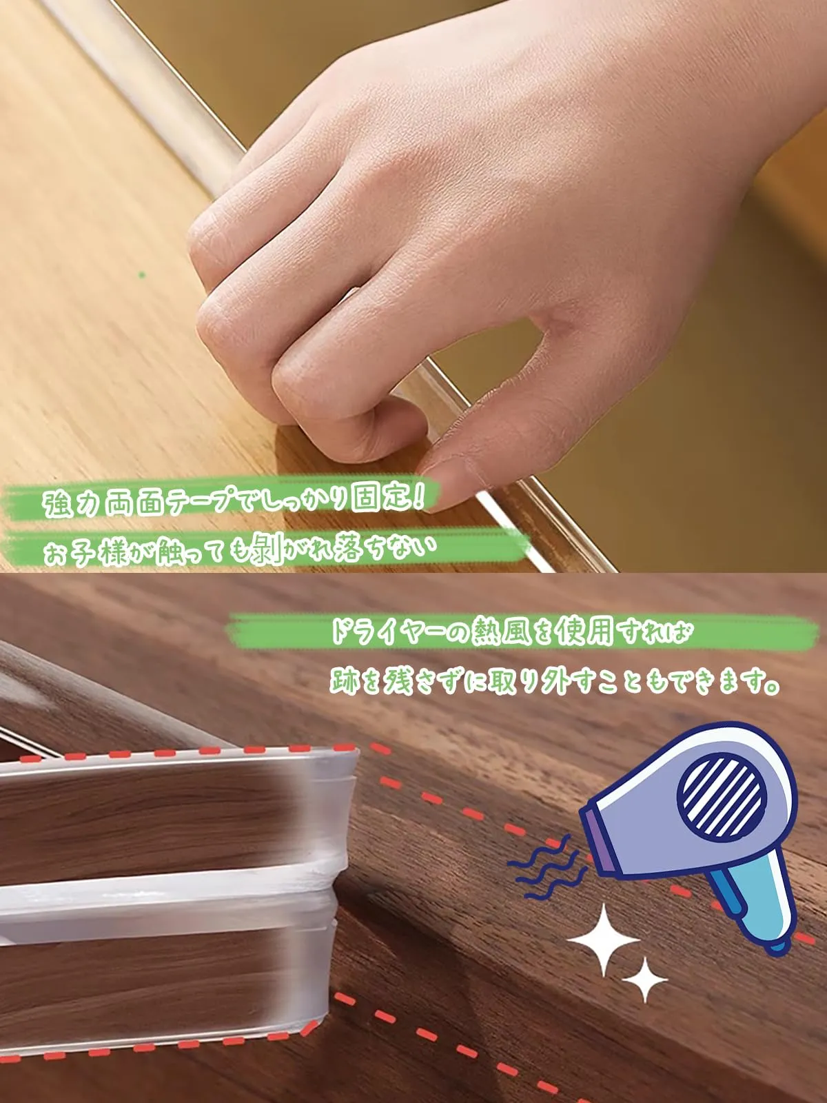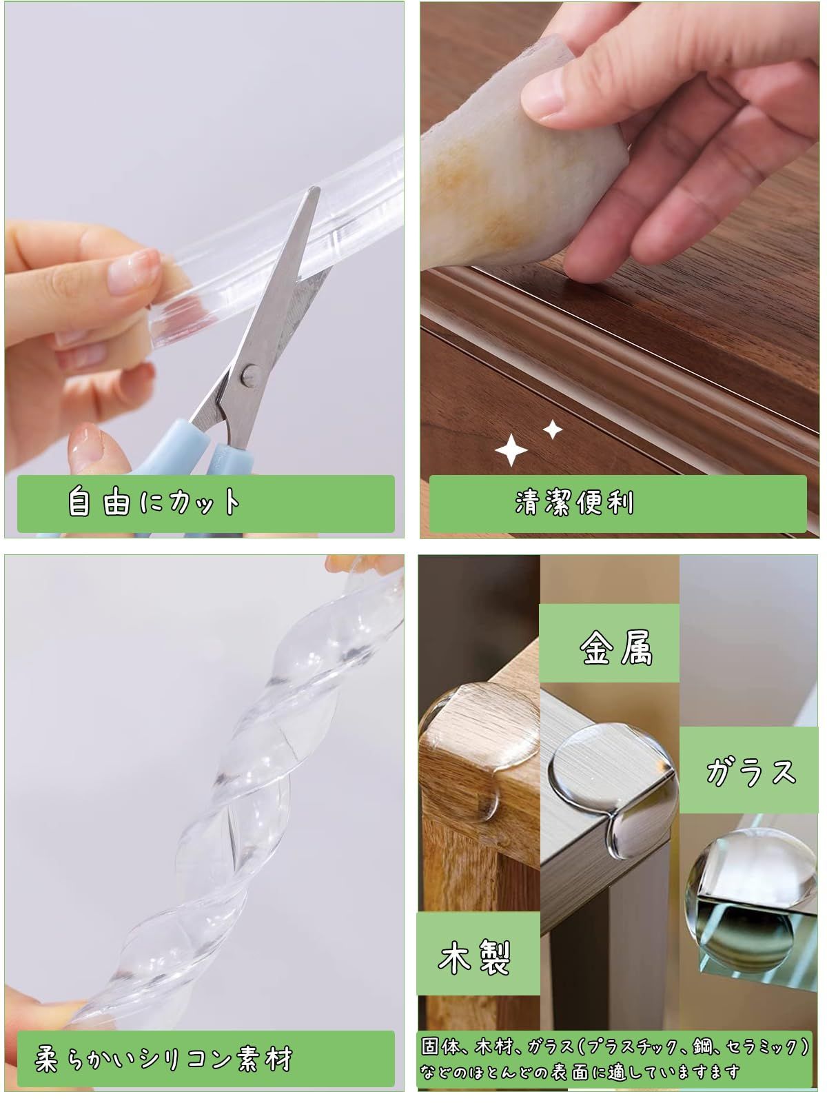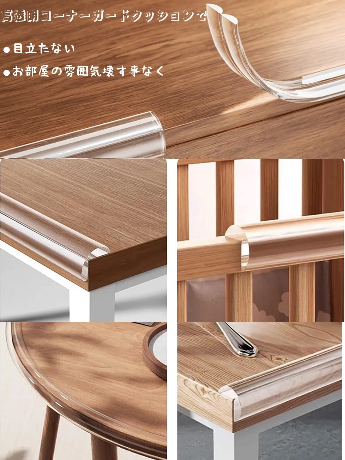 無毒安全エコ素材でクッション性がある柔らかい素材を採用し、子供安全、安心なお住まいの為アイテムです。お母さんたち安心にご利用させるコーナーパッドです。透明なデザインで室内のインテリアとびったり!目立ちにくく、お子様の目に止まりにくいので剥がし防止になります。