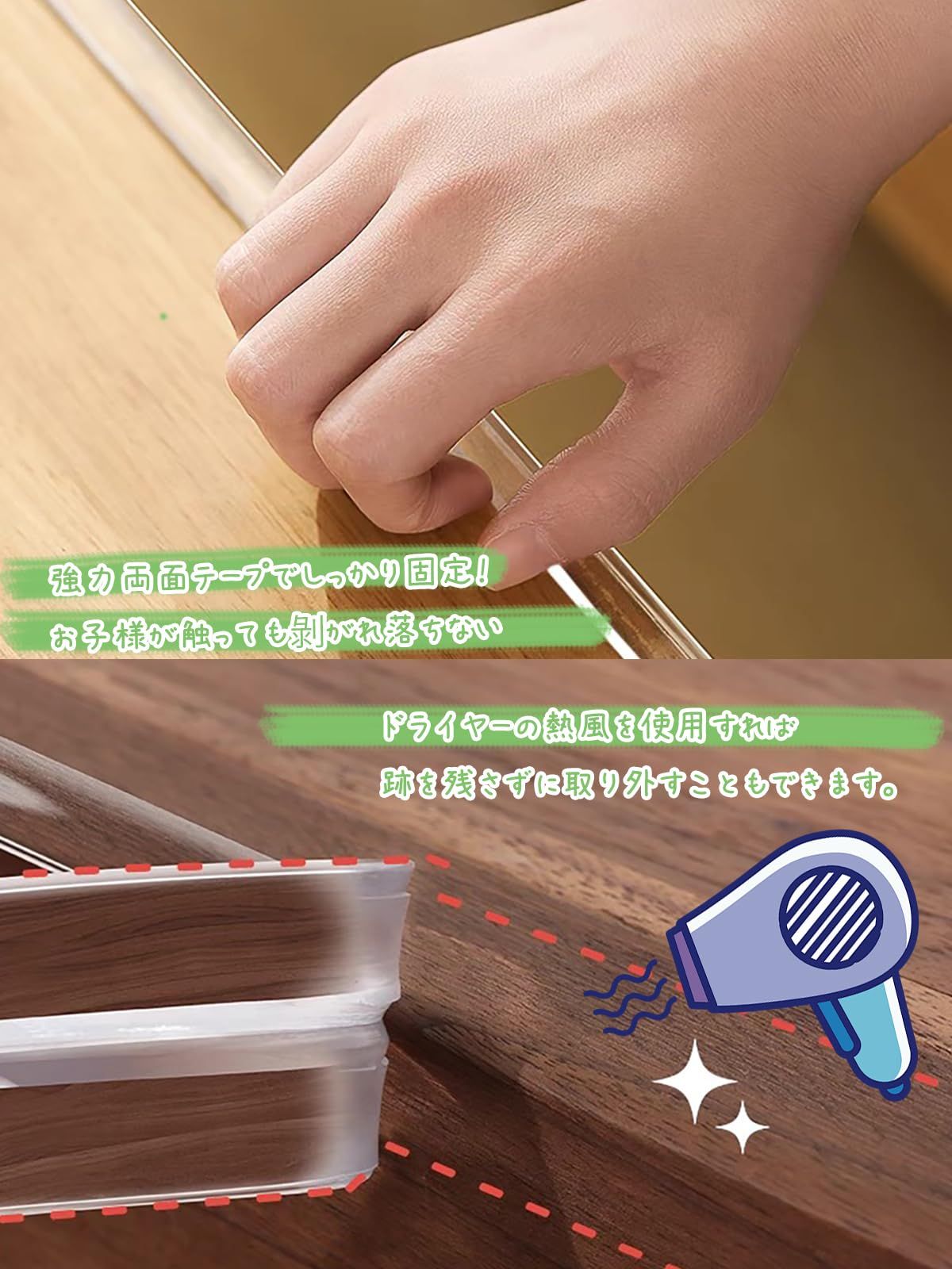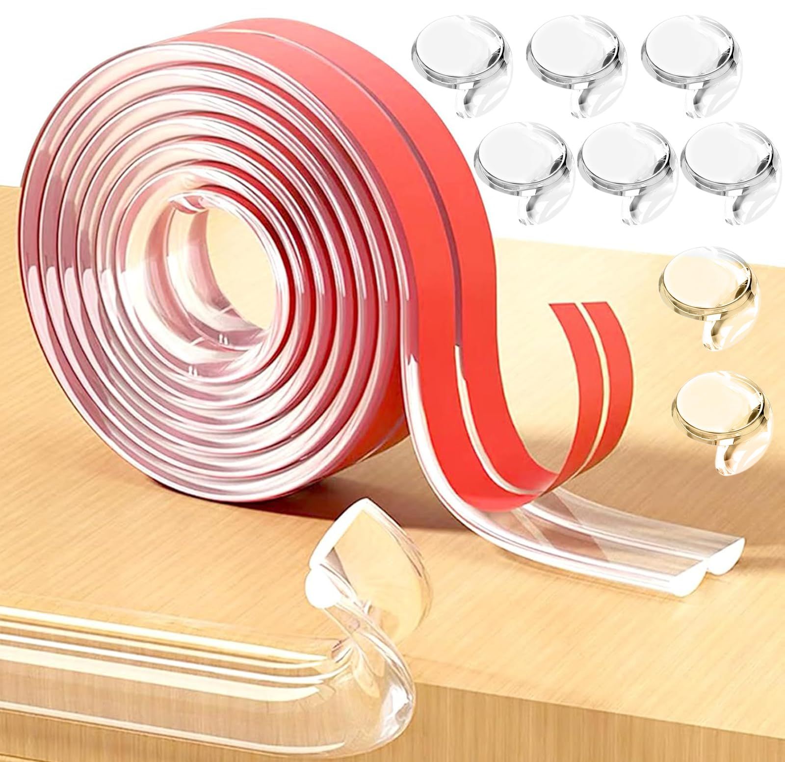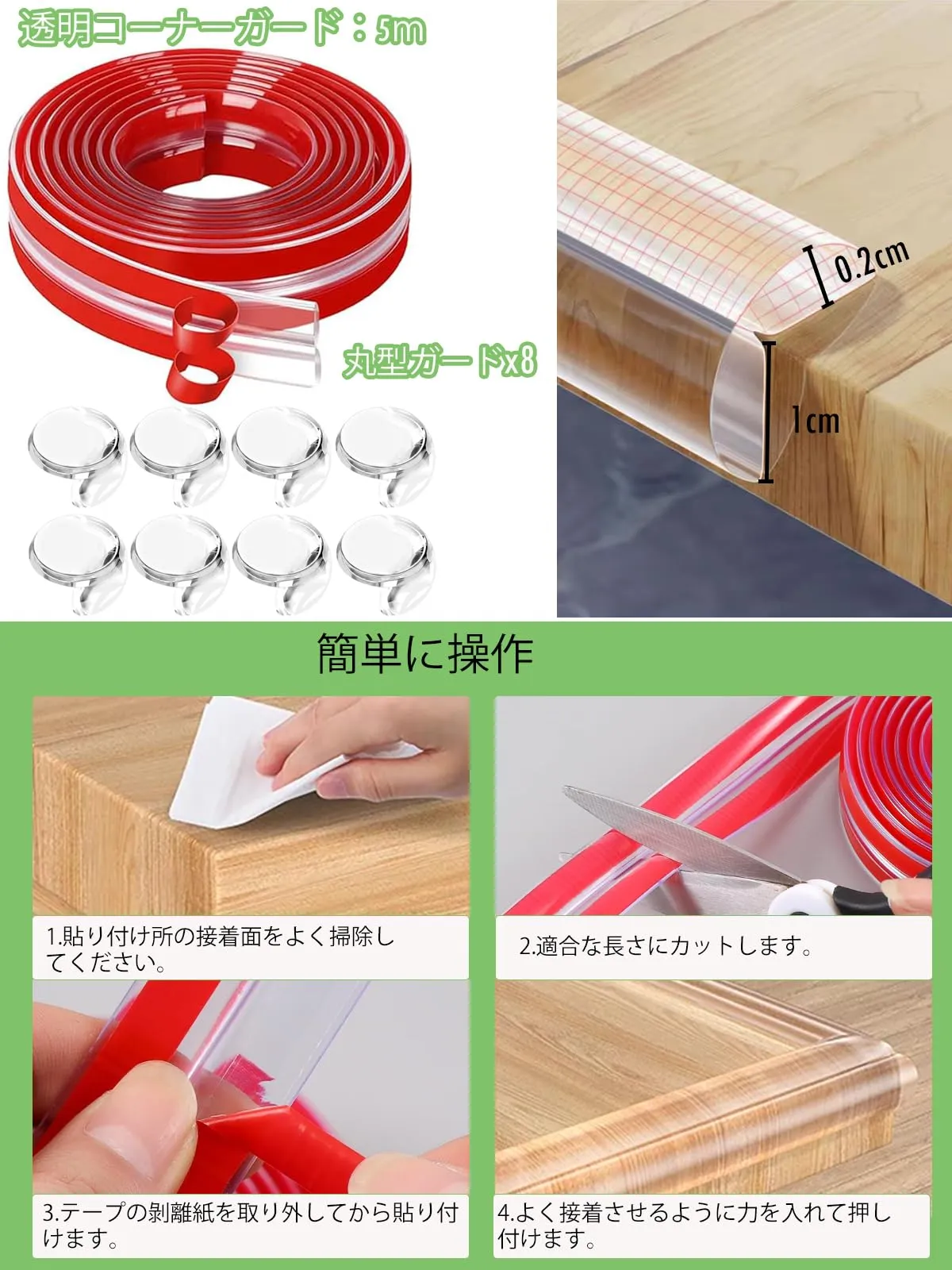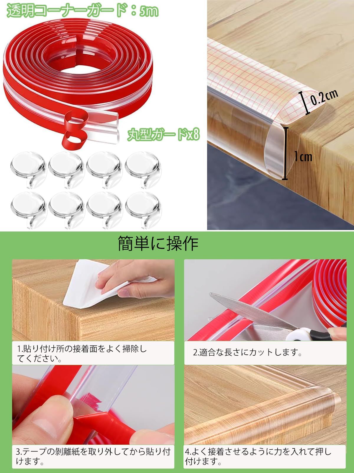 【製品仕様】透明コーナーテープ: 5M×1cm×0.2cm, 丸型コーナーガード: 2cm×2.5cm×1cm×8個 改良版の透明コーナークッションは両面テープ貼り済み、装着時間が大幅に短縮します。家族の衝突傷害を防ぐ 家具の鋭い角や縁に貼ることで、子供の走行衝突、高齢者のぶつかり事故による擦り傷・打撲などの重傷を回避し、家庭の安全を守ります。