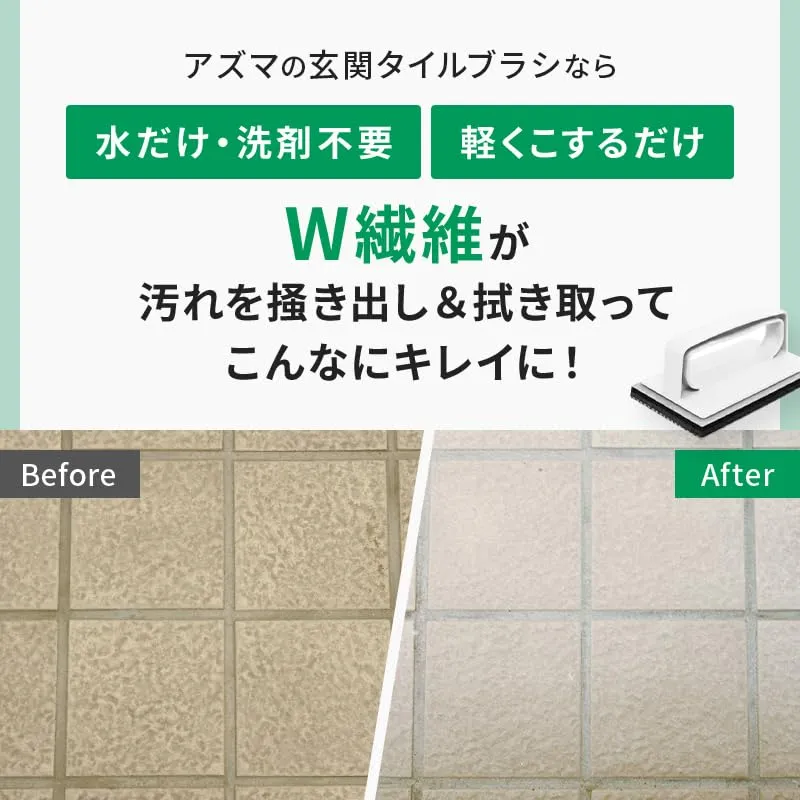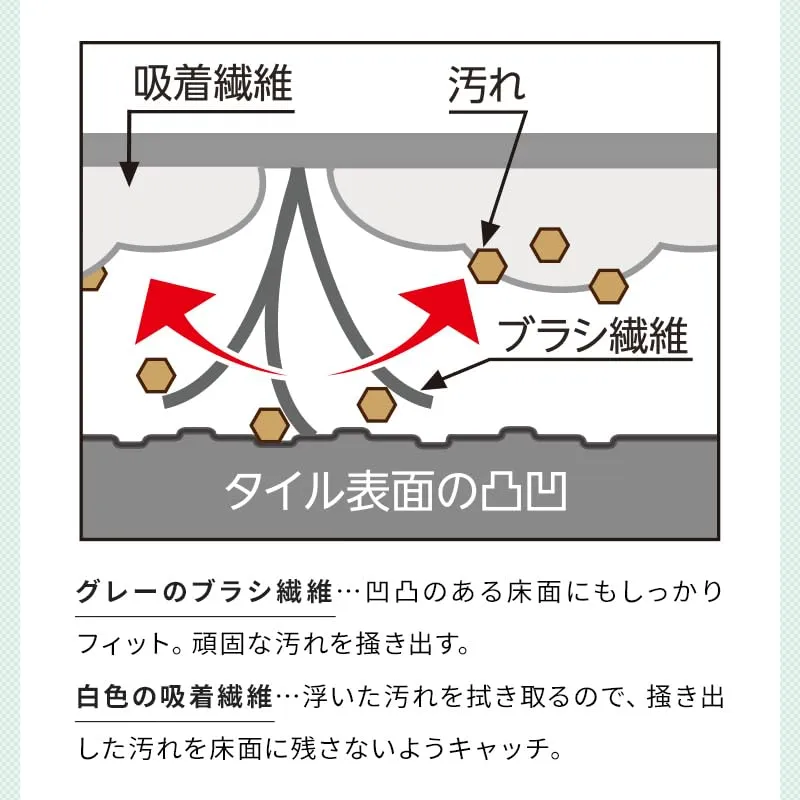【外壁・玄関に】玄関タイル・外壁・コンクリートの汚れ・コケ・鳥のフン落としに。特長の異なるW繊維使用。毛足の長いブラシ繊維が外壁などの表面の凸凹に入り込んで汚れをかき出し、吸着繊維が浮いた汚れを拭き取ります。水だけで傷をつけずに汚れをスッキリ落とします。