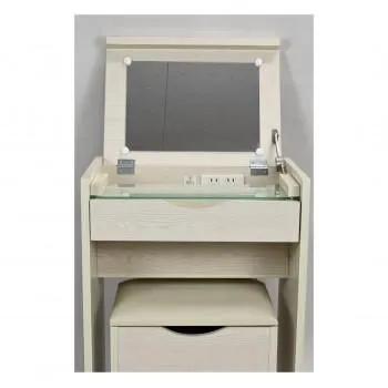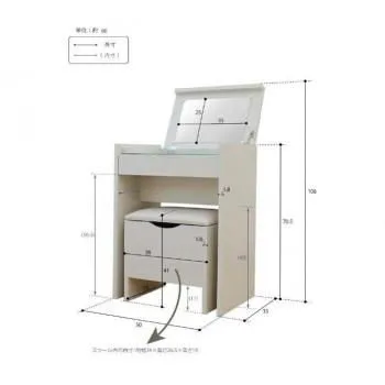 計1500Wの2口コンセント付き。ヘアアイロンやスマートフォンの充電に便利です。天板を開けると、全体の高さは108cmになります。浅型の引出しには、アクセサリーやコスメなどの小物を整理して収納できます。深型の収納スペースには、ロングボトルやロング缶を立てて収納できます。スツール下には、大容量の収納スペースがあり、買い置きしているコスメなどの収納にも役立ちます。