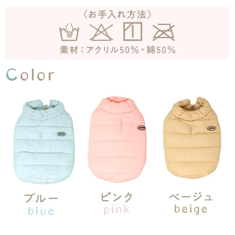 【中綿入りのダウン風デザインで冬の防寒に】保温性を考えた中綿仕様で、秋冬の散歩やお出かけ時の寒さ対策に役立つ犬用アウターです。