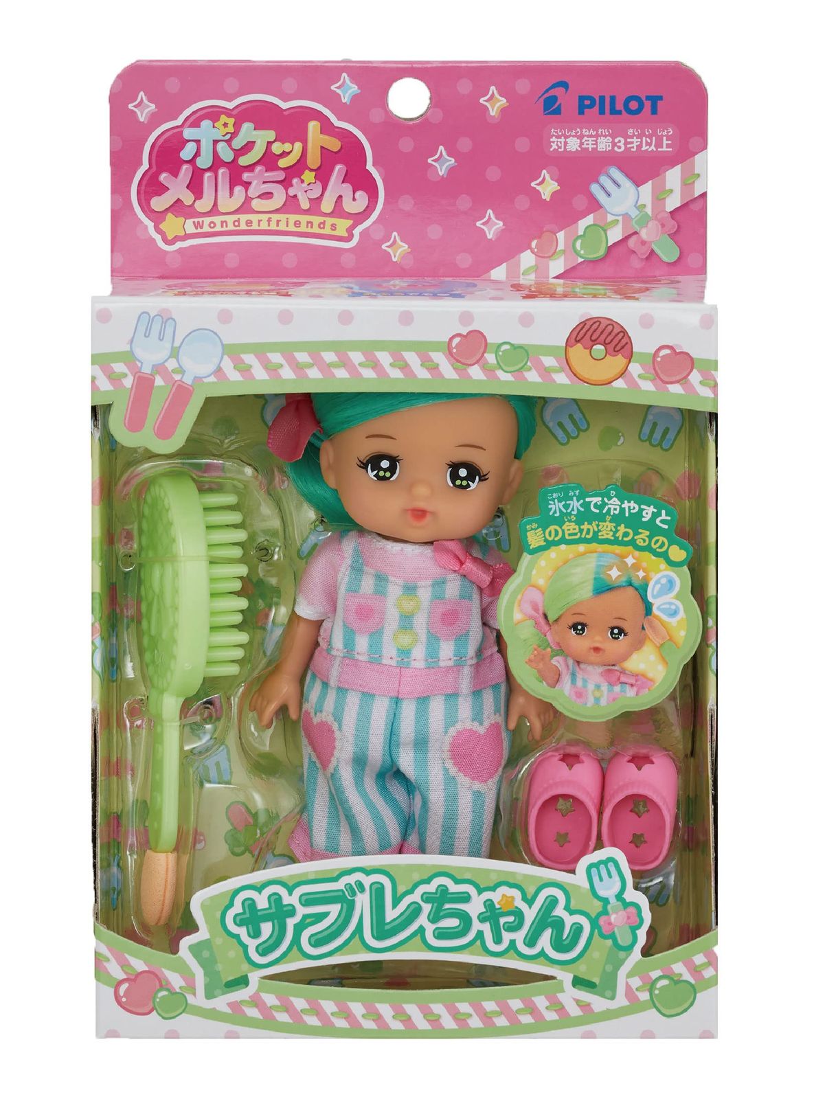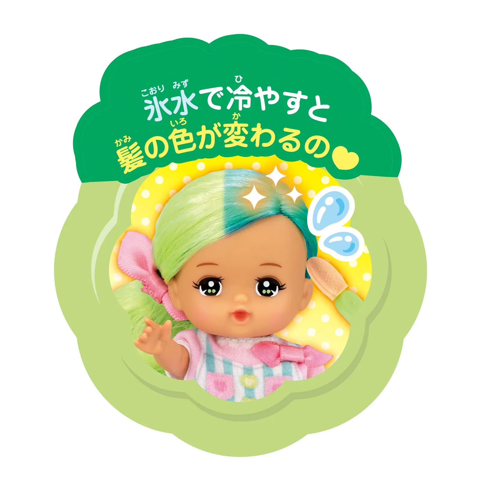 手のひらサイズで、いつでもどこでもつれて遊べるポケットメルちゃんシリーズ。メルちゃんのおともだちサブレちゃんは氷水で冷やすと髪の色がライトグリーンからグリーンに変化するよ。手で温めると元の色に戻ります。