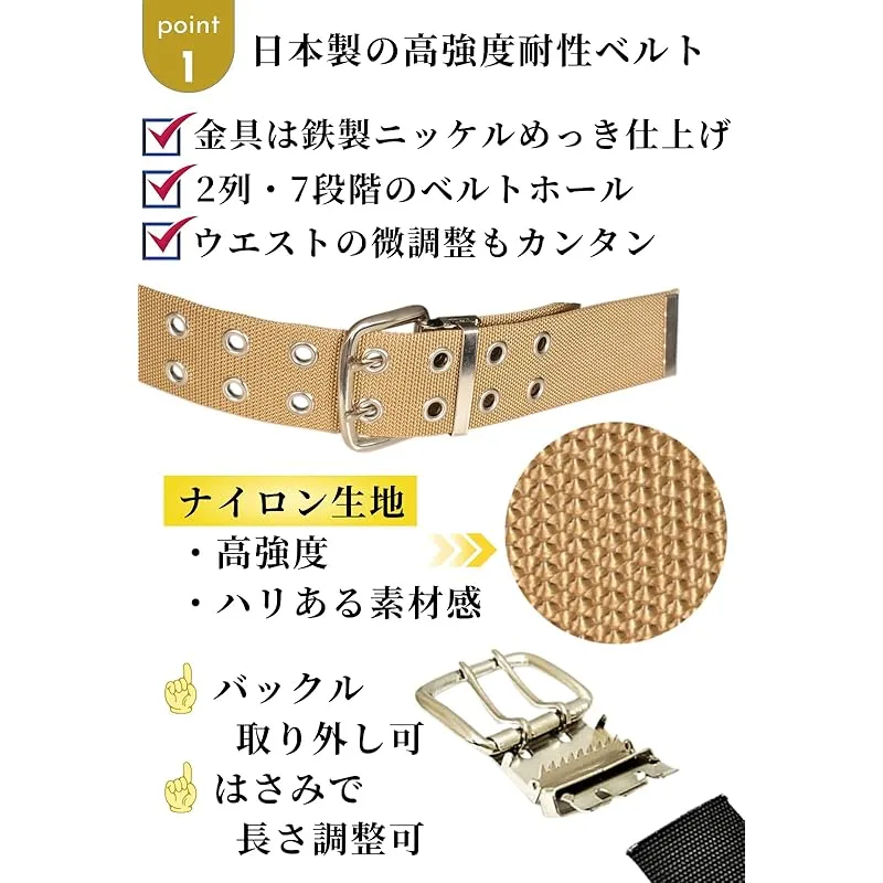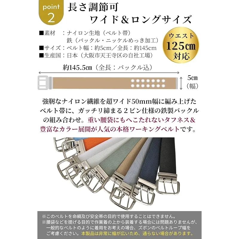 【商品説明】 安心・安全の日本製作業ベルト ガッチリ50幅、ナイロン繊維製の作業ベルトです。 固定力の高い2ピンバックルを採用し、対応ウエストサイズの目安は約125cmまでと体格の良い方にも対応可能。 バックル金具を外してベルトをカットすれば長さを詰めることができ、細身の方もOKです。 ベルトホール(穴)は7段階調整可能、ベルト先端(剣先)は先ガネ金具つき。 ※本品を命綱用や身体を吊る用途に使用しないでください※