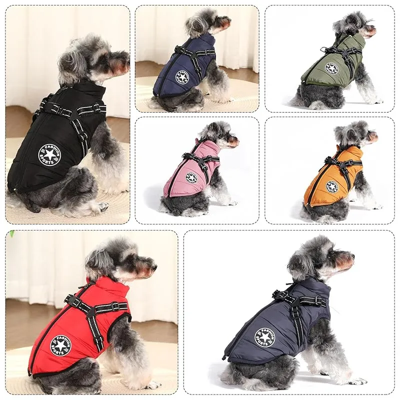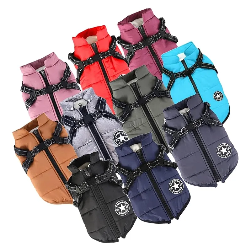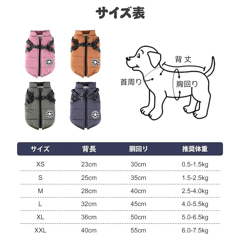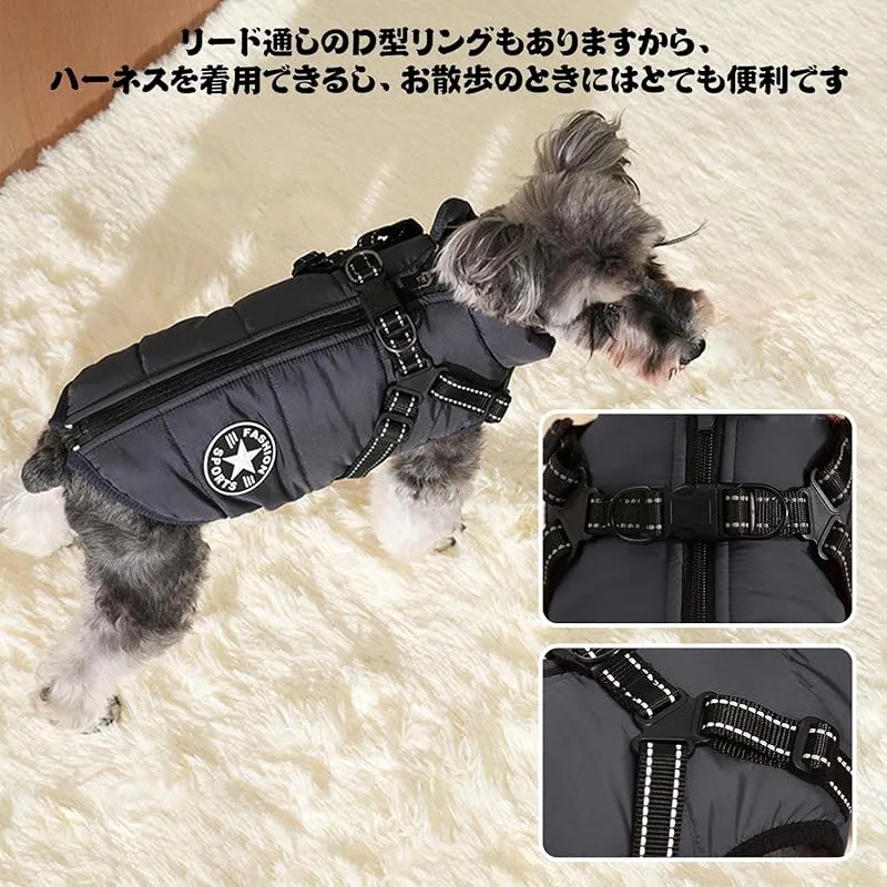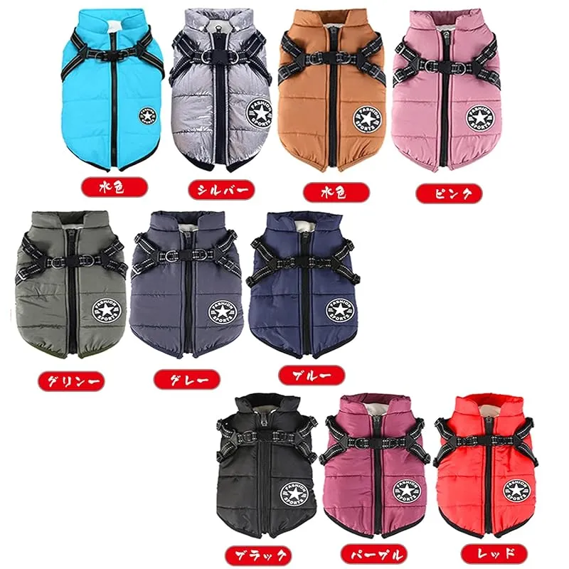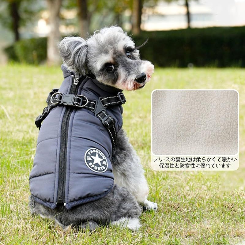 【商品概要】 ハーネスと一体型するベスト風コート、それに、リードのD型リングもあり、牽引ロープを服の後ろに掛けることができます。散歩に出かけるのに便利です。 袖無しタイプのダウンジャケットはちゃんと暖かくて動きやすい! フリースの裏地、とてもあたたかなペット用防寒服です。秋冬シーズンに防寒が最適 背中開きタイプとなっているので、着替えやすくて脱着が簡単なデザインです。お手入れも簡単です。 毎日一緒に生活する愛犬が自宅でも散歩中でも、外出先でもこんなオシャレな服を着せると、注目を浴びるアイテムに間違いなし。