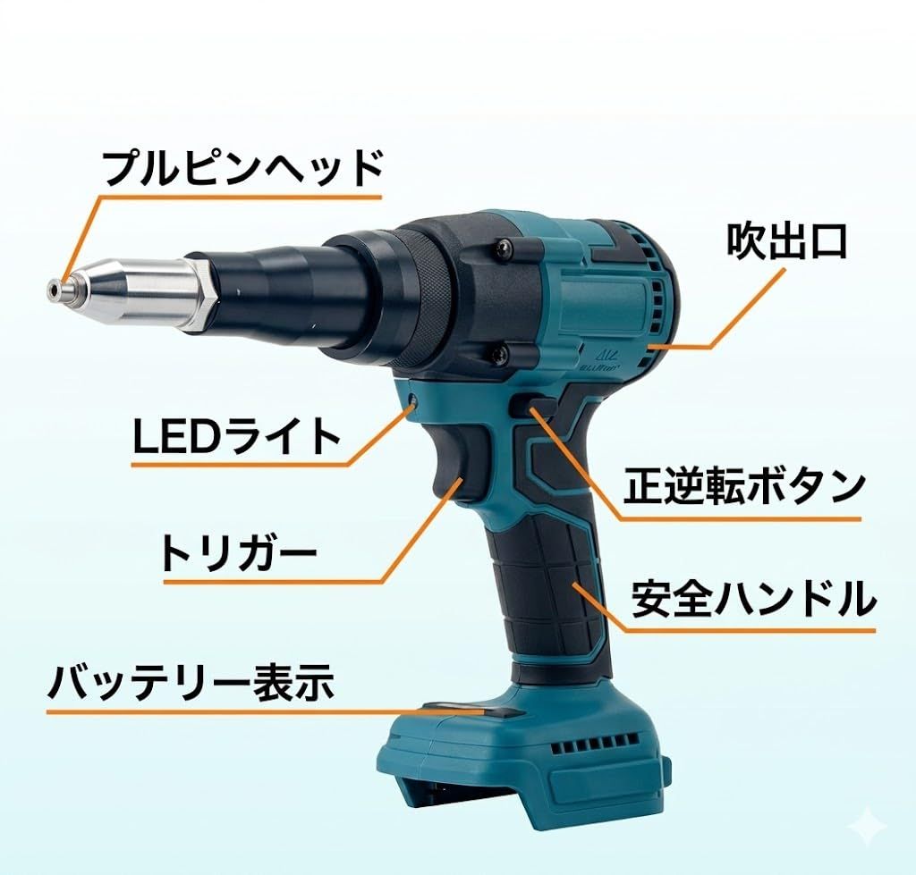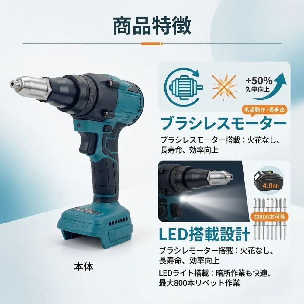 MORABLU 電動リベッター マキタ互換 コードレス ブラシレス 充電式 リベットガン 2.4〜4.8mm LEDライト付 バッテリー別売 社外品