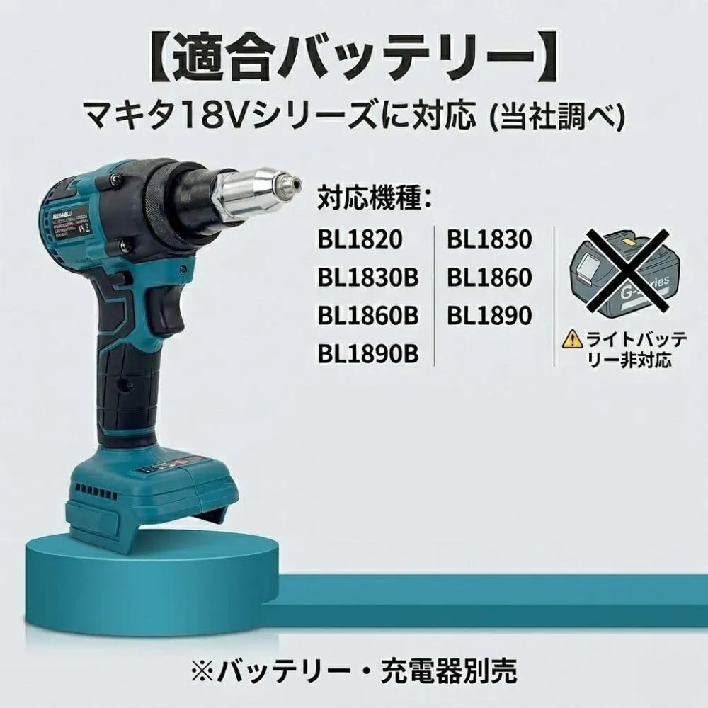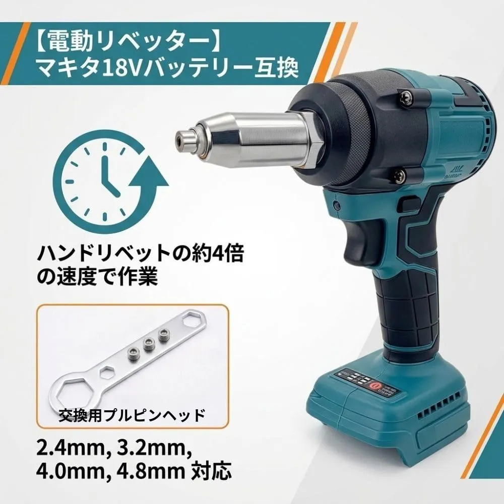 【電動リベッター】マキタ18Vバッテリー互換の電動リベッターです。最大トルク40Nmでハンドリベットの約4倍の速度で作業が可能です。2.4mm、3.2mm、4.0mm、4.8mmのリベットに対応しています。