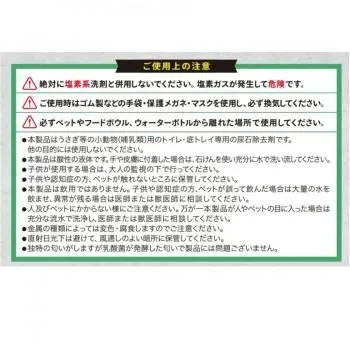天然成分由来の発酵乳酸成分でペットや人、環境にやさしい。トイレやケージの金属部分への腐食性が低く、高い除去能力で除菌効果も。トイレやケージの底トレイに付着した尿石汚れをきれいにします。