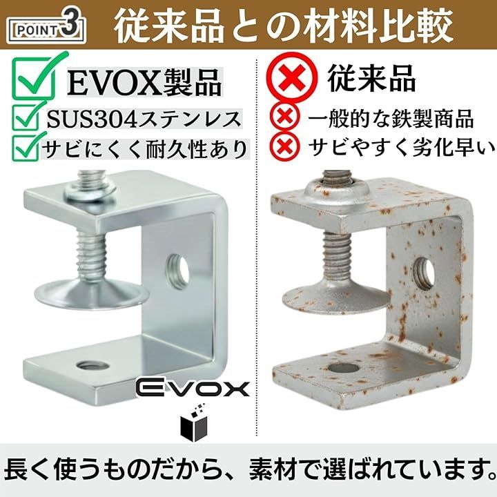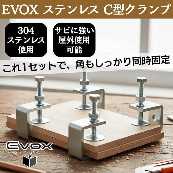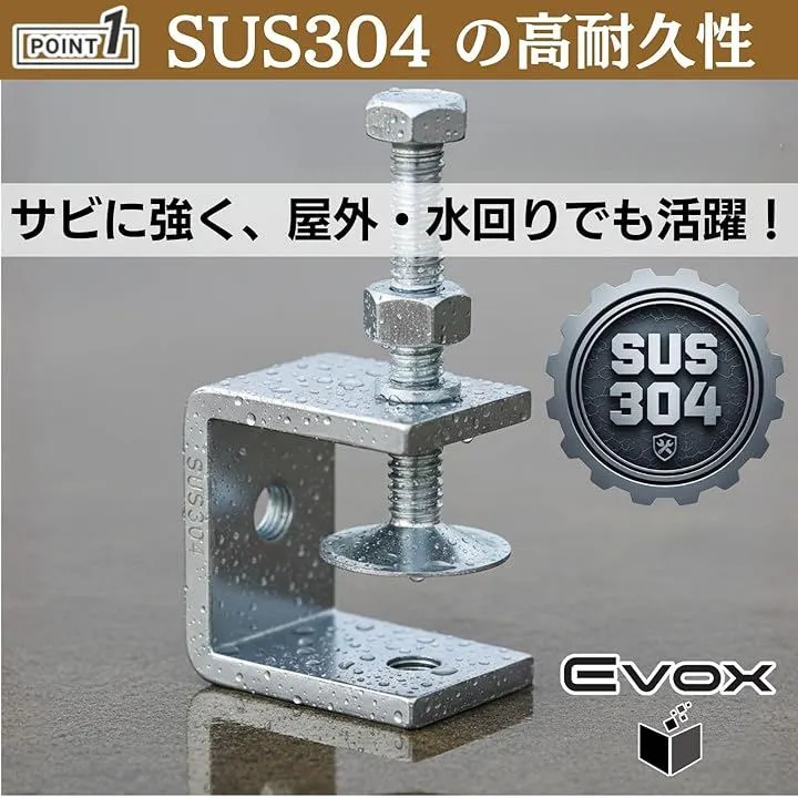 「高品質な304ステンレス採用」このC型クランプは、サビに強く耐久性に優れた304ステンレスを使用しており、屋外や湿気の多い場所での作業でも長く愛用いただけます。
