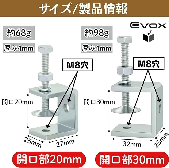 「サイズ/商品詳細」*開口部20mmタイプ:幅約25mm 奥行約27mm M8の穴2か所 重さは約68g *開口部30mmタイプ:幅約25mm 奥行約32mm M8の穴2か所 重さは約98g。