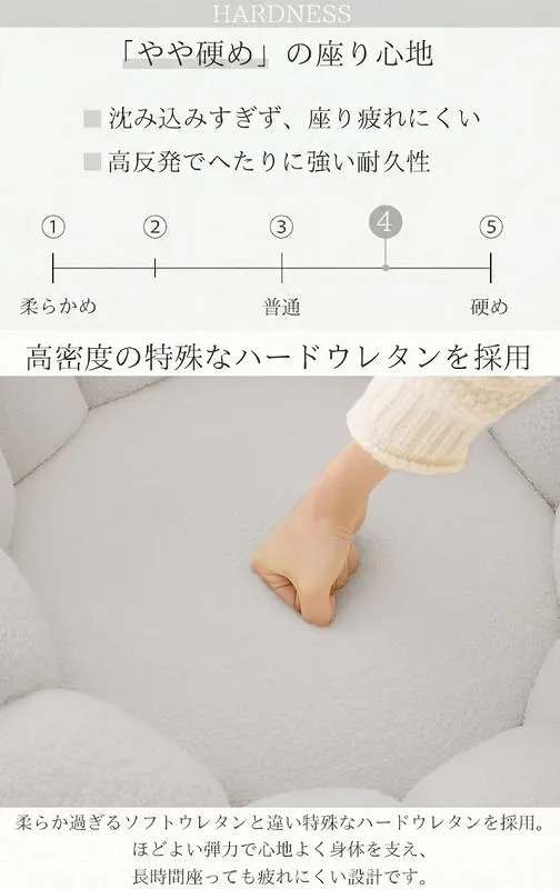 ■圧縮でもくつろぎ感はそのまま、快適な座り心地 コンパクトに圧縮された状態で届きつつも、復元後はしっかりとした厚みと弾力があり一般的なソファと変わらない快適な座り心地を実現。