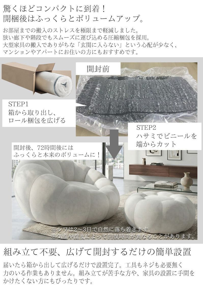 ■設置方法 1.包みを取り、折りたたまれたソファを床に平らに置きます。 2.ビニール袋を端からカットします。ハサミなどを使用して、布地を傷つけないようにご注意ください。 3.密閉された袋を開けると、ソファはすぐに膨らみ始めます。 乾燥した状態に保ち、ソファを軽く叩いて弾力回復を早めます。 72時間後にはふっくらと本来のボリュームに! 4.ソファの使用中、床が長時間湿った状態にならないように注意し、換気不足によるカビの発生を避けてください。